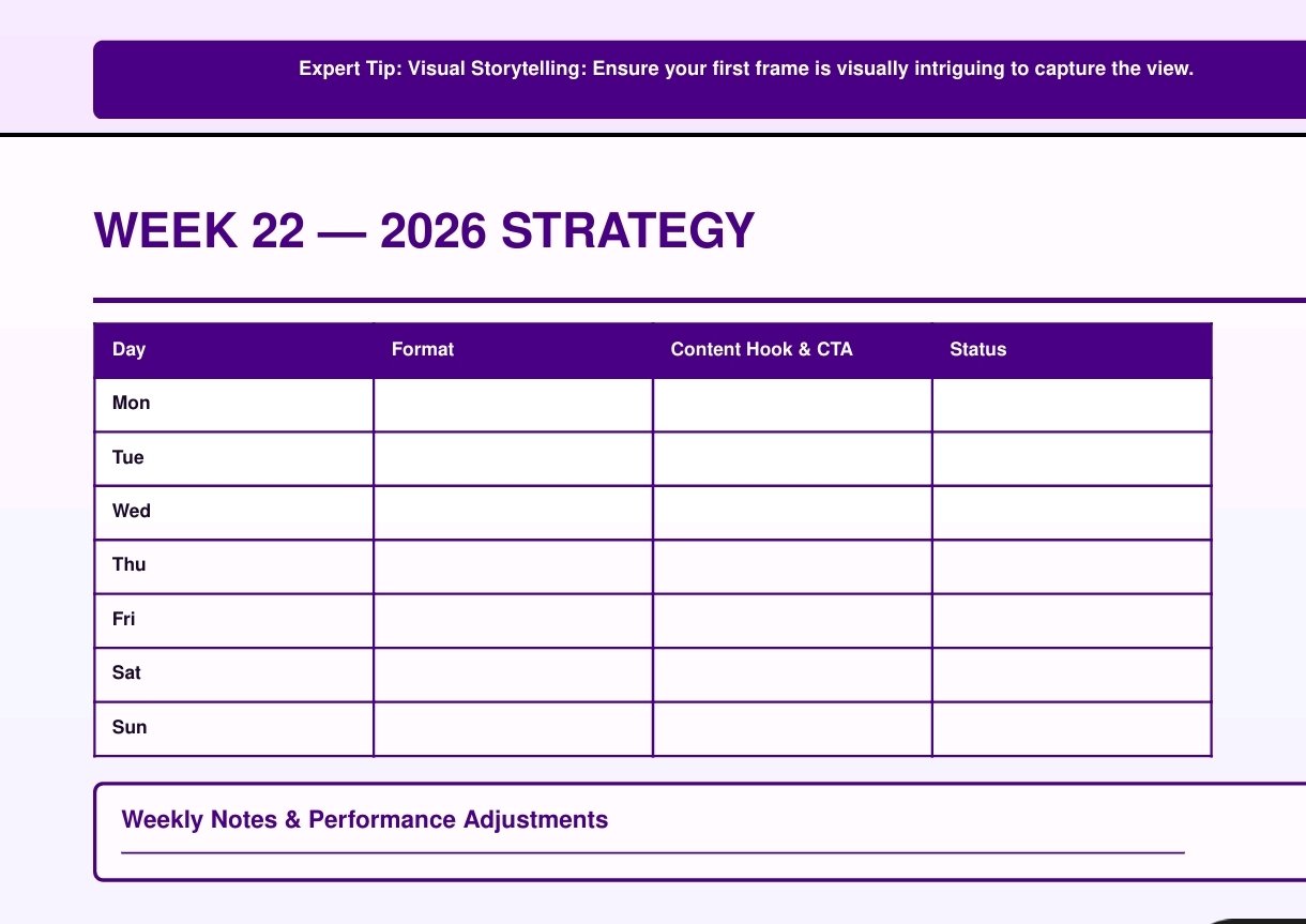 Weekly Planning Pages (with columns for platform, format, headline/hook, and status)
