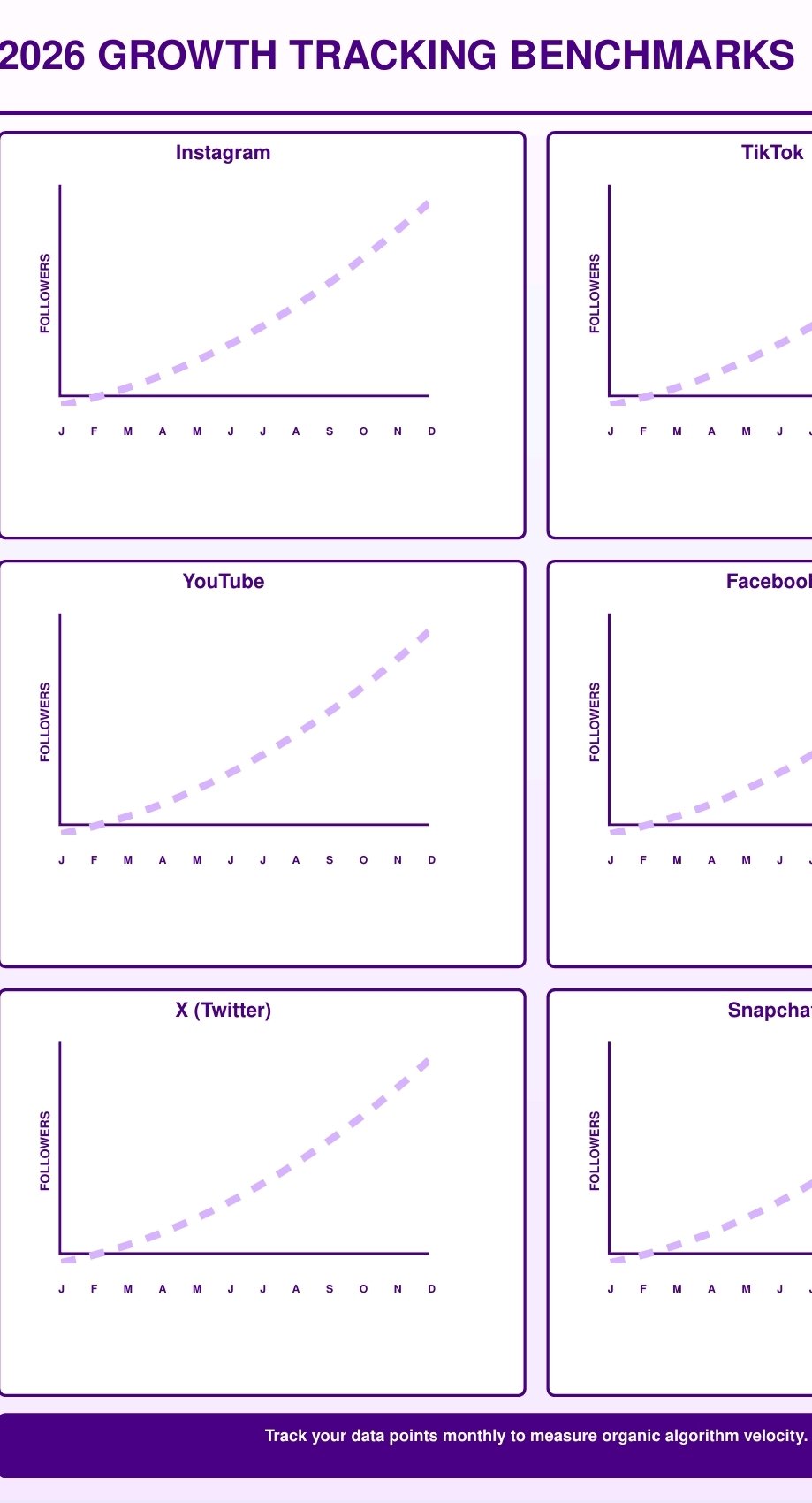 2026/2027 Growth Benchmarks with graph templates for Instagram, TikTok, YouTube, Facebook, X, and Snapchat