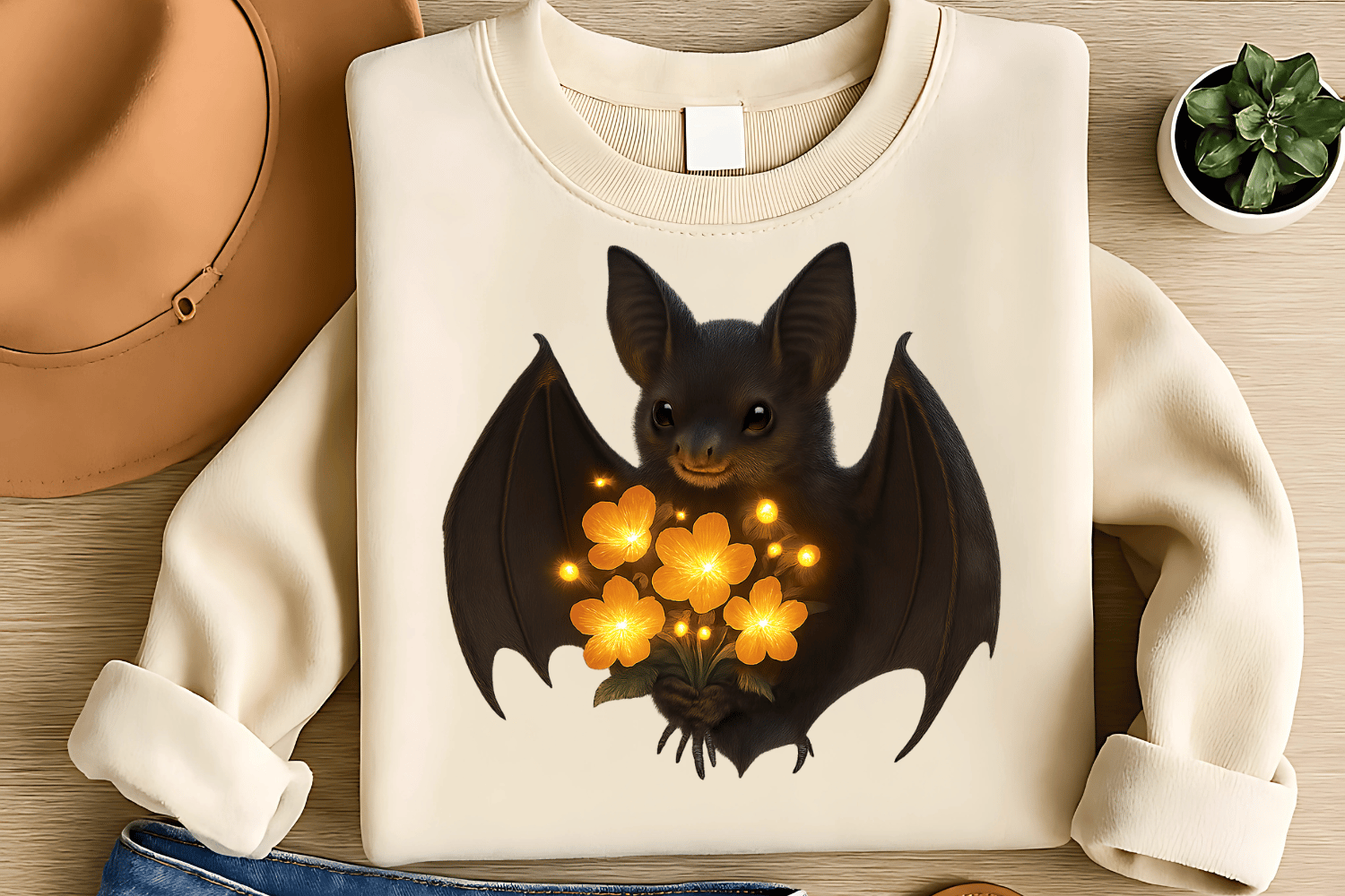 Enchanted Bat Bouquet Sublimation PNG – Halloween Bat and Flowers for T-Shirts – Magical Gothic Theme – 300 DPI Instant Digital Download