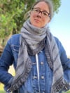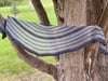 This is a paid for knitting pattern. This shawl is knit from the top down and is crescent shaped. It uses garter stitch sections with eyelet sections throughout the body, and has a ruffled edging. It uses two different bases (single ply fingering weight and lace weight mohair/silk) in the same colorway to achieve a tonal, striped look. Feel free to use different colorways or even two of the same base. Shawls are a great way to play with color and texture.