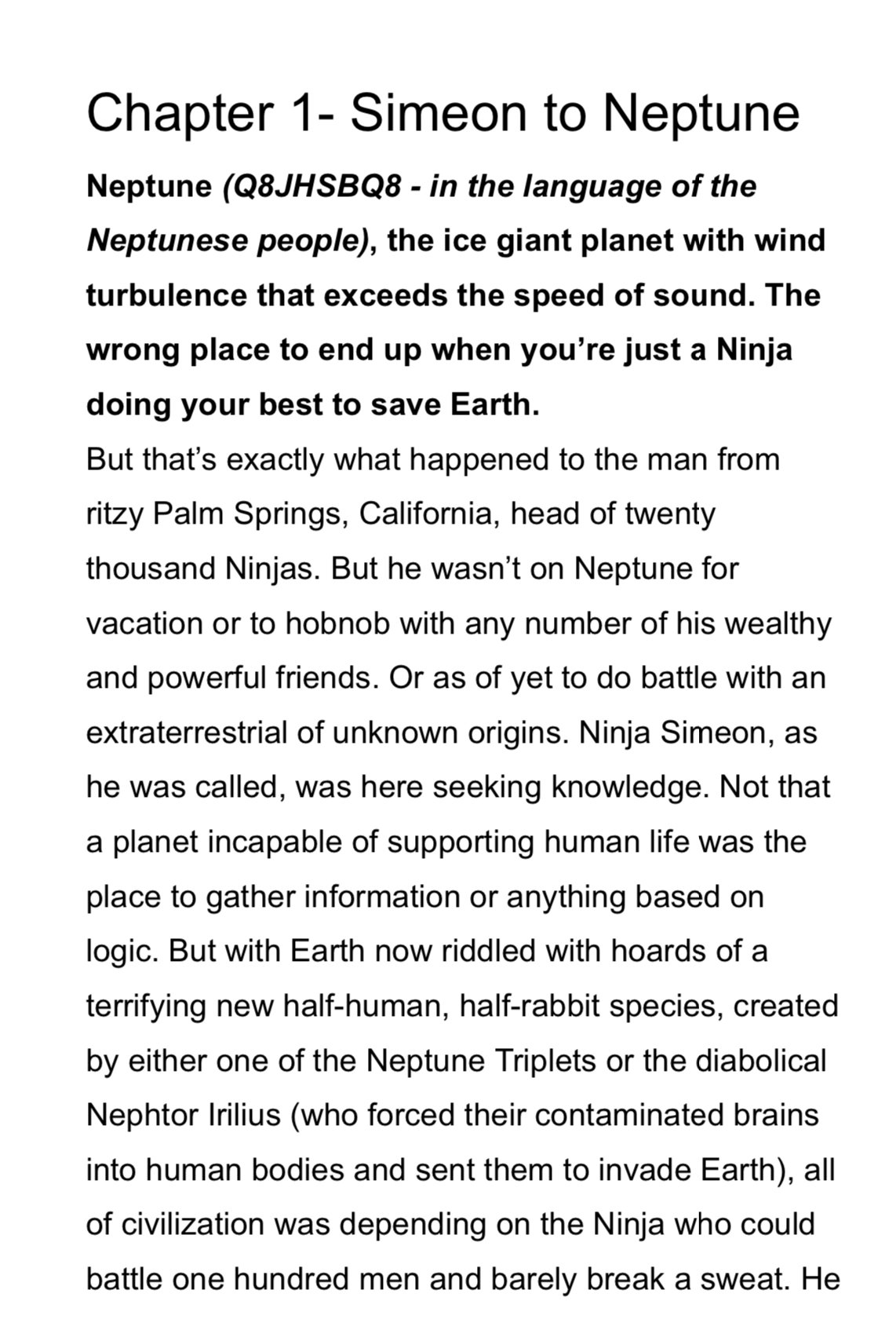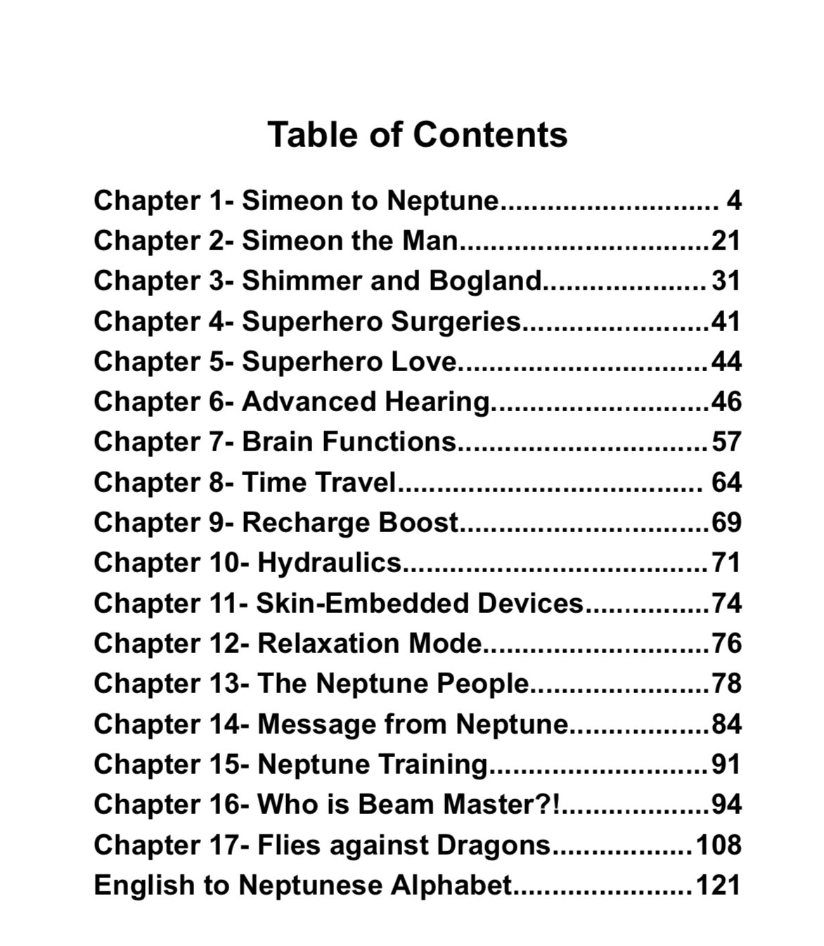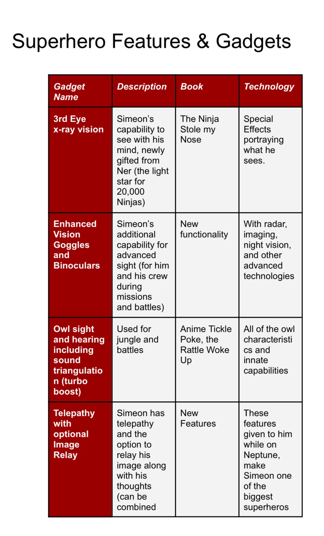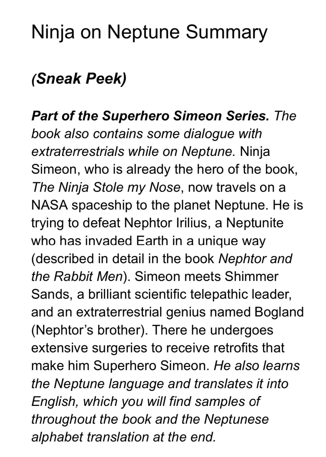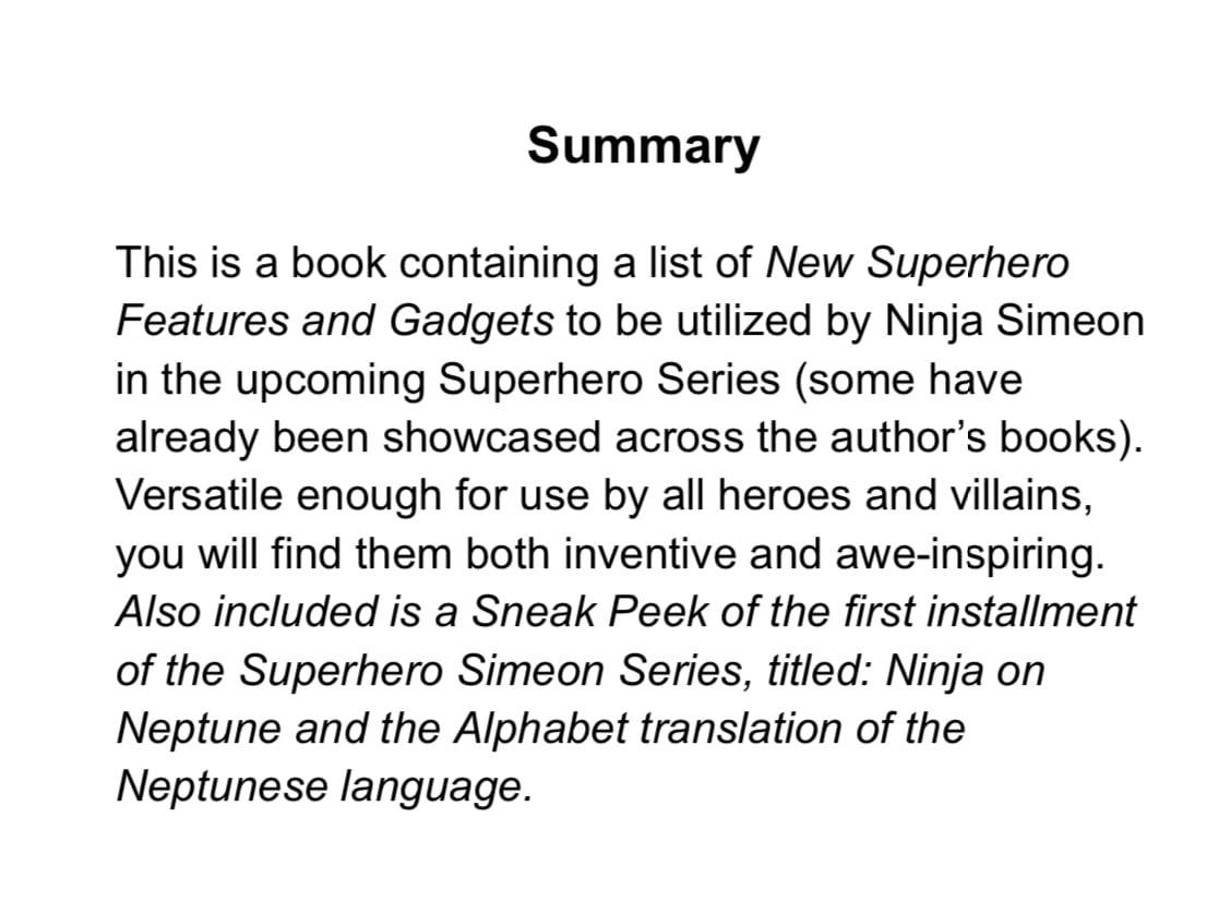 This is a book containing a list of New Superhero Features and Gadgets to be utilized by Ninja Simeon in the upcoming Superhero Series (some have already been showcased across the author’s books). Versatile enough for use by all heroes and villains, you will find them both inventive and awe-inspiring. Also included is a Sneak Peek of the first installment of the Superhero Simeon Series, titled: Ninja on Neptune and the Alphabet translation of the Neptunese language.