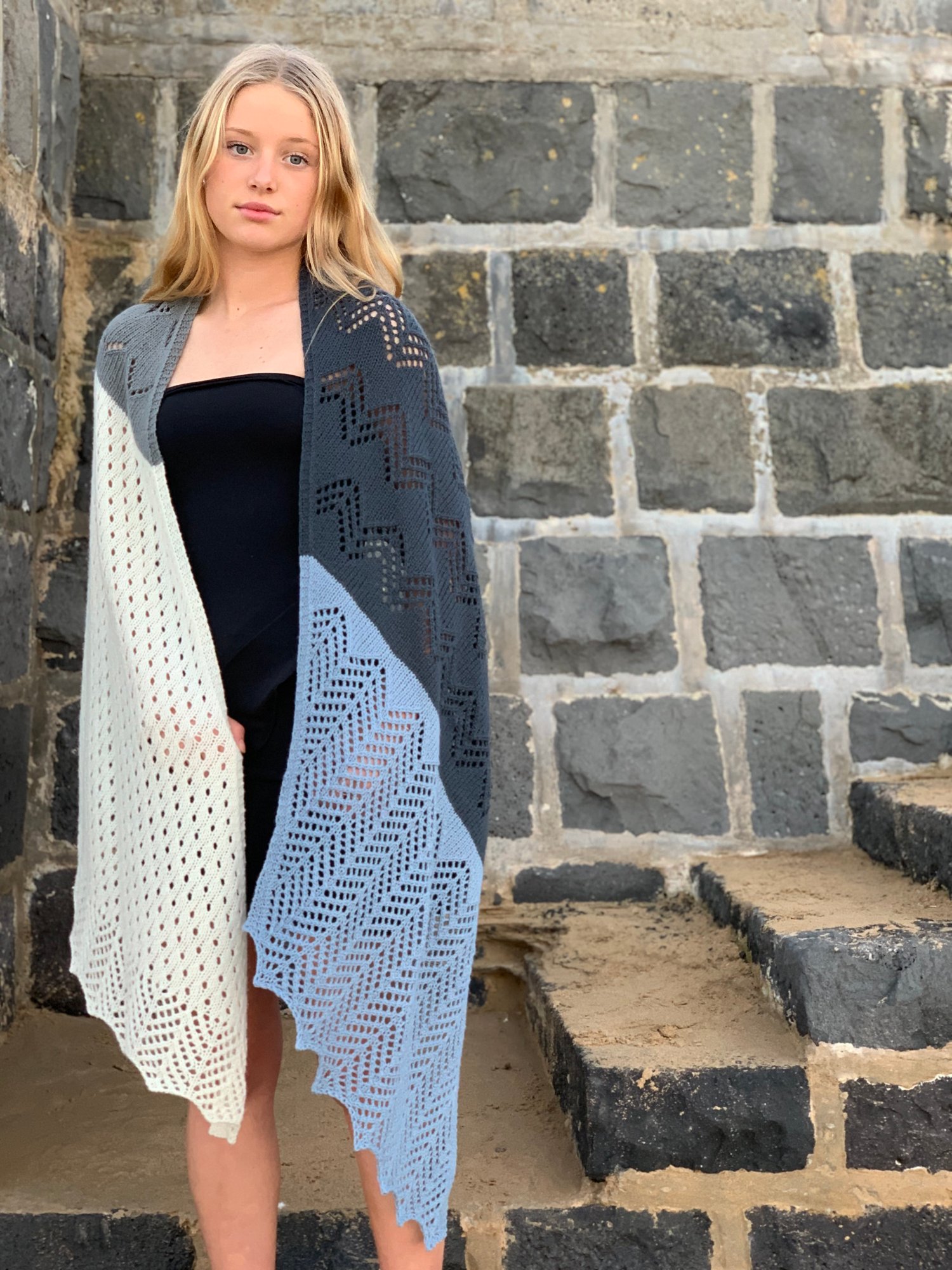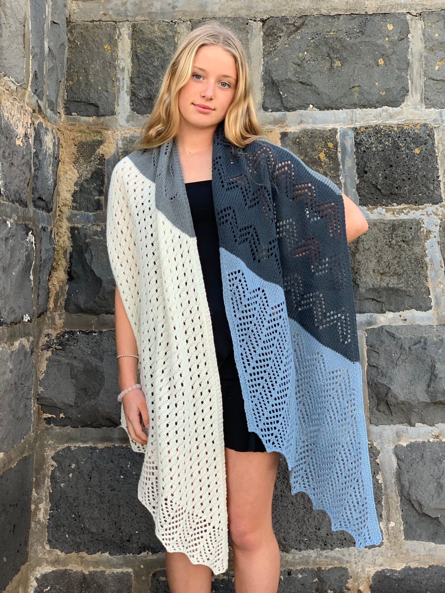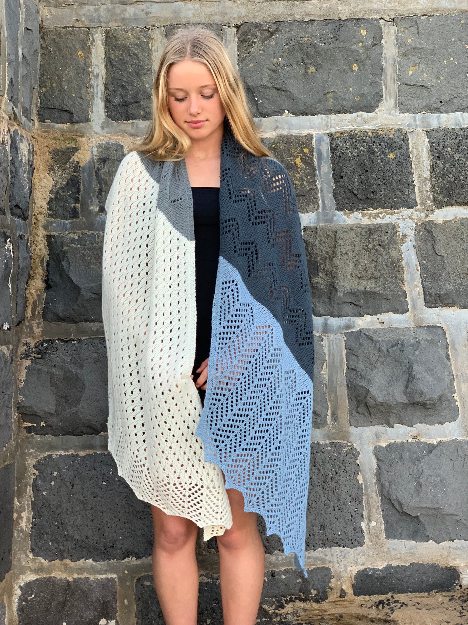 Superb Fairywren is a generous sized wrap. The repetitive stitch patterns are meditative and aim to capture the flighty characteristics of the wee bird this wrap takes its name from. Four colours of 4ply/fingering yarn are used to create a wrap that is not only enjoyable to knit but is a delight to wear; its generous size making it a wrap that invites snuggling into. Knit from end to end, decreases and increases are used to create angled ends.