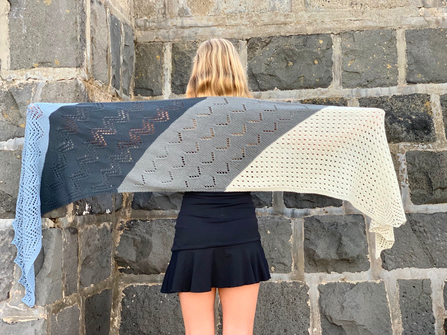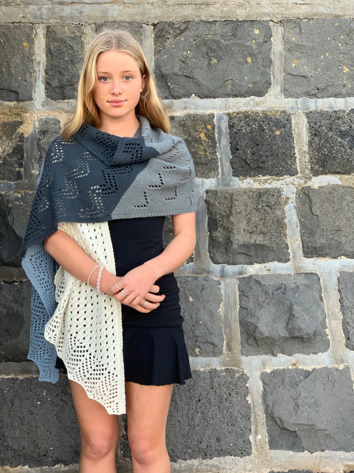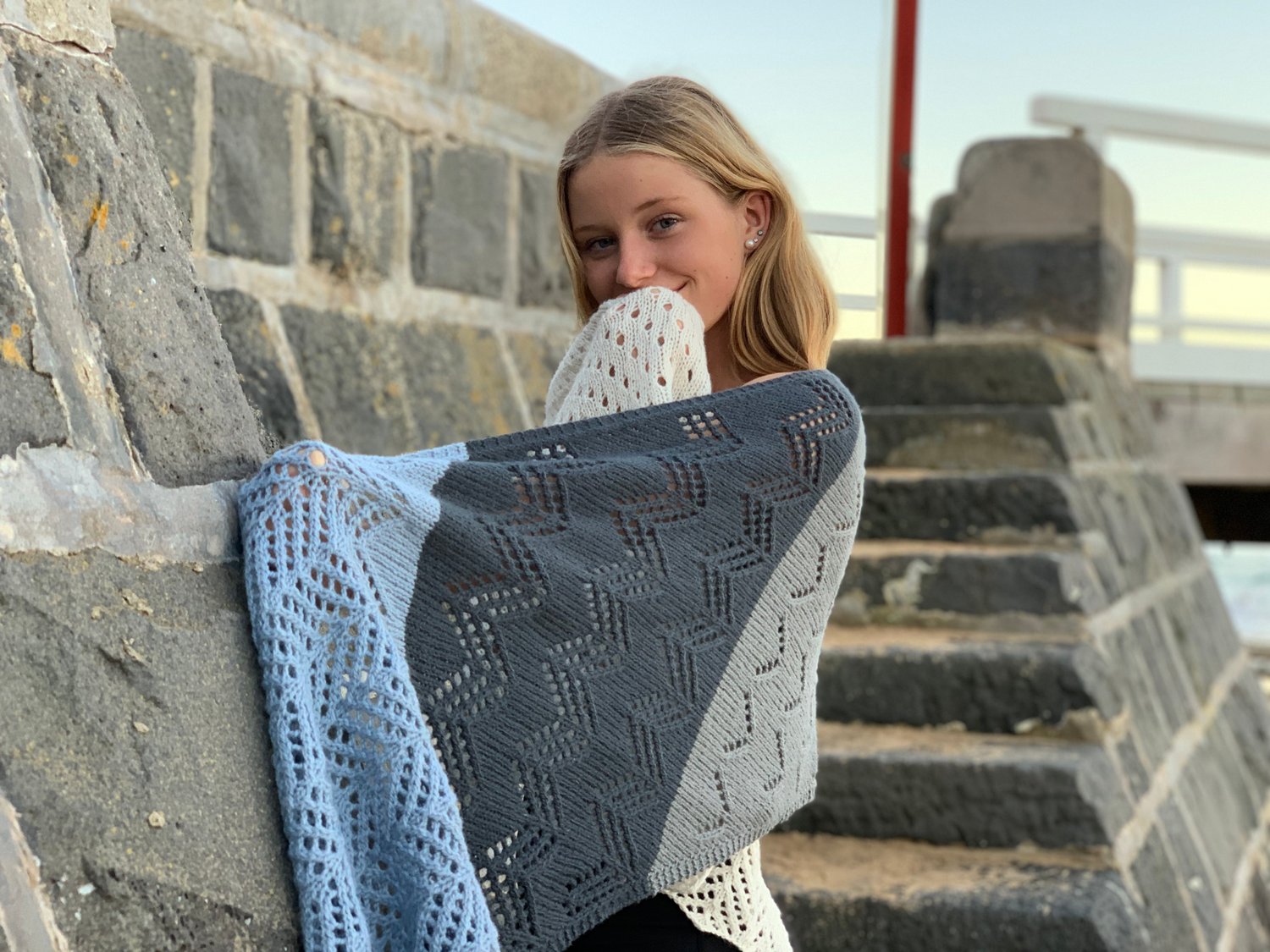Superb Fairywren is a generous sized wrap. The repetitive stitch patterns are meditative and aim to capture the flighty characteristics of the wee bird this wrap takes its name from. Four colours of 4ply/fingering yarn are used to create a wrap that is not only enjoyable to knit but is a delight to wear; its generous size making it a wrap that invites snuggling into. Knit from end to end, decreases and increases are used to create angled ends.