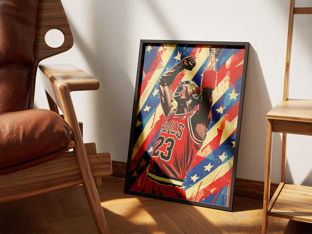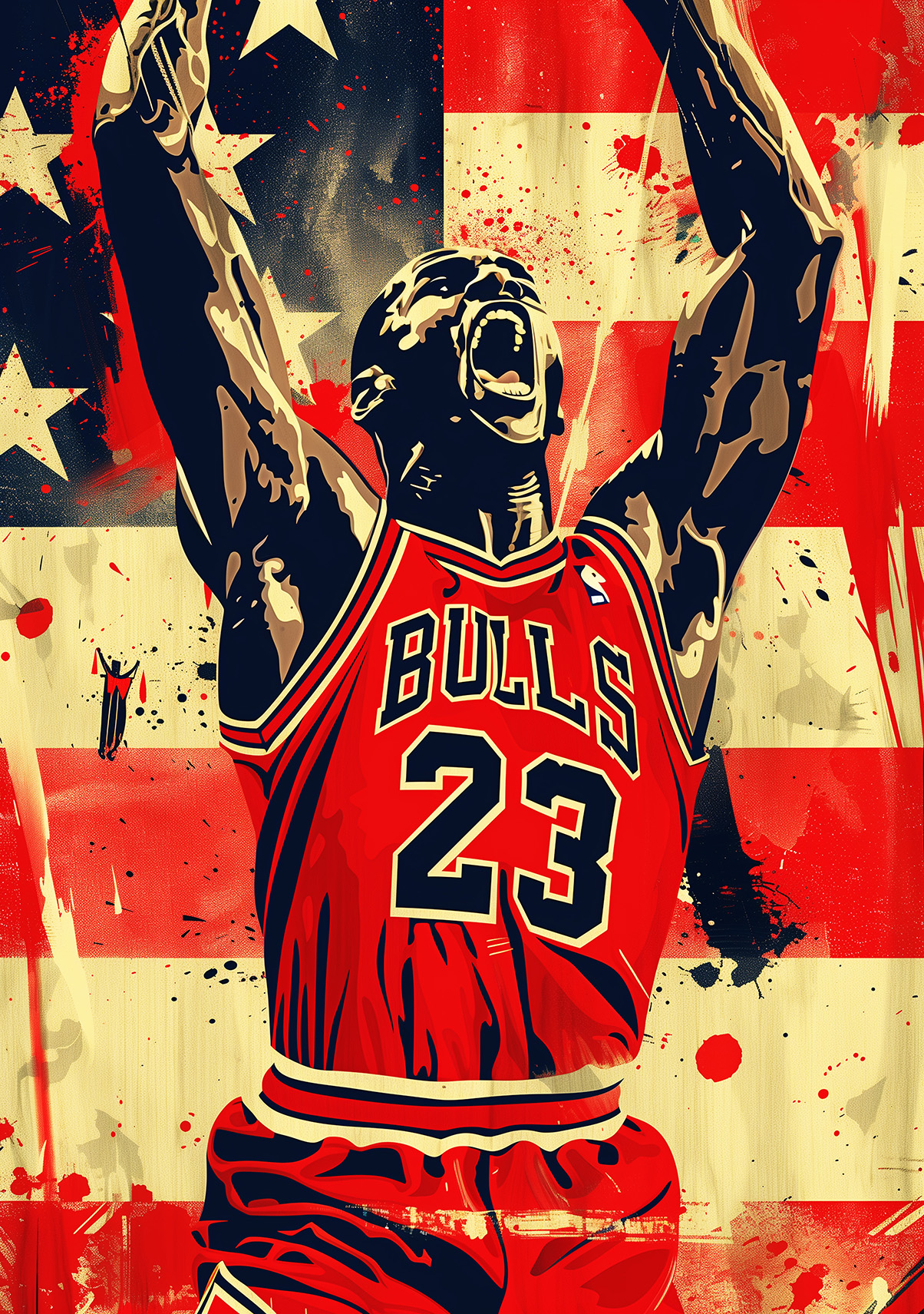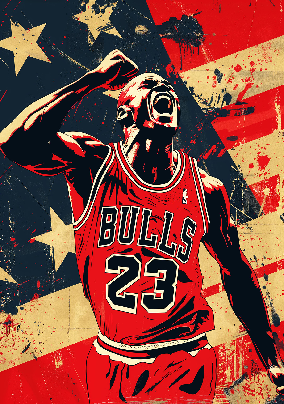 Celebrate the legacy of a basketball legend with "Jordan: America’s Airborne Icon." This poster captures Michael Jordan in all his glory, symbolizing excellence, determination, and the unyielding spirit of greatness. Set against a bold backdrop inspired by the red, white, and blue of America, the design honors his impact both on and off the court. Perfect for fans of the GOAT and his enduring influence, this piece is a powerful tribute to Jordan’s role as an American sports icon.