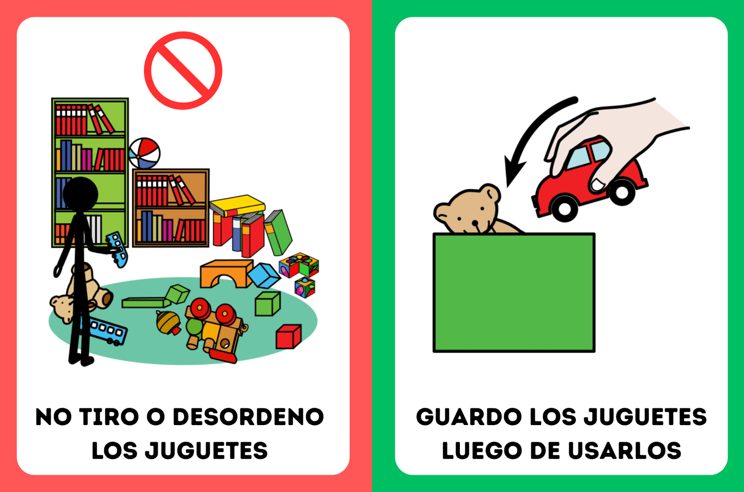 - Más de 25 banners con frases como: “Levanto la mano para hablar / No interrumpo”, “Guardo los juguetes / No desordeno”