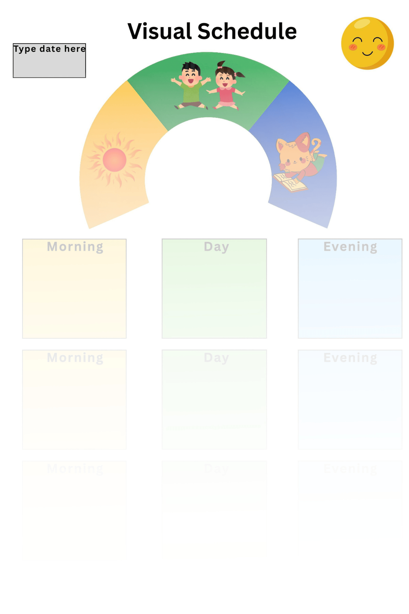 Help your child follow a clear daily routine with this Visual Schedule PDF Template. Includes boxes for Morning, Day, and Evening activities.