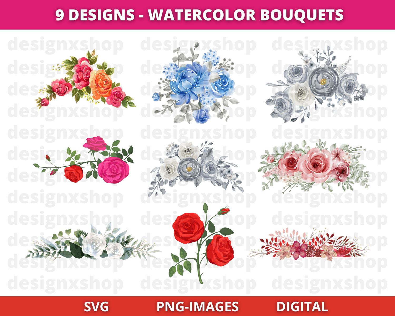 9 Designs - Watercolor Flowers Set Free Download, hi-res digital CLIP ART (with transparent background).