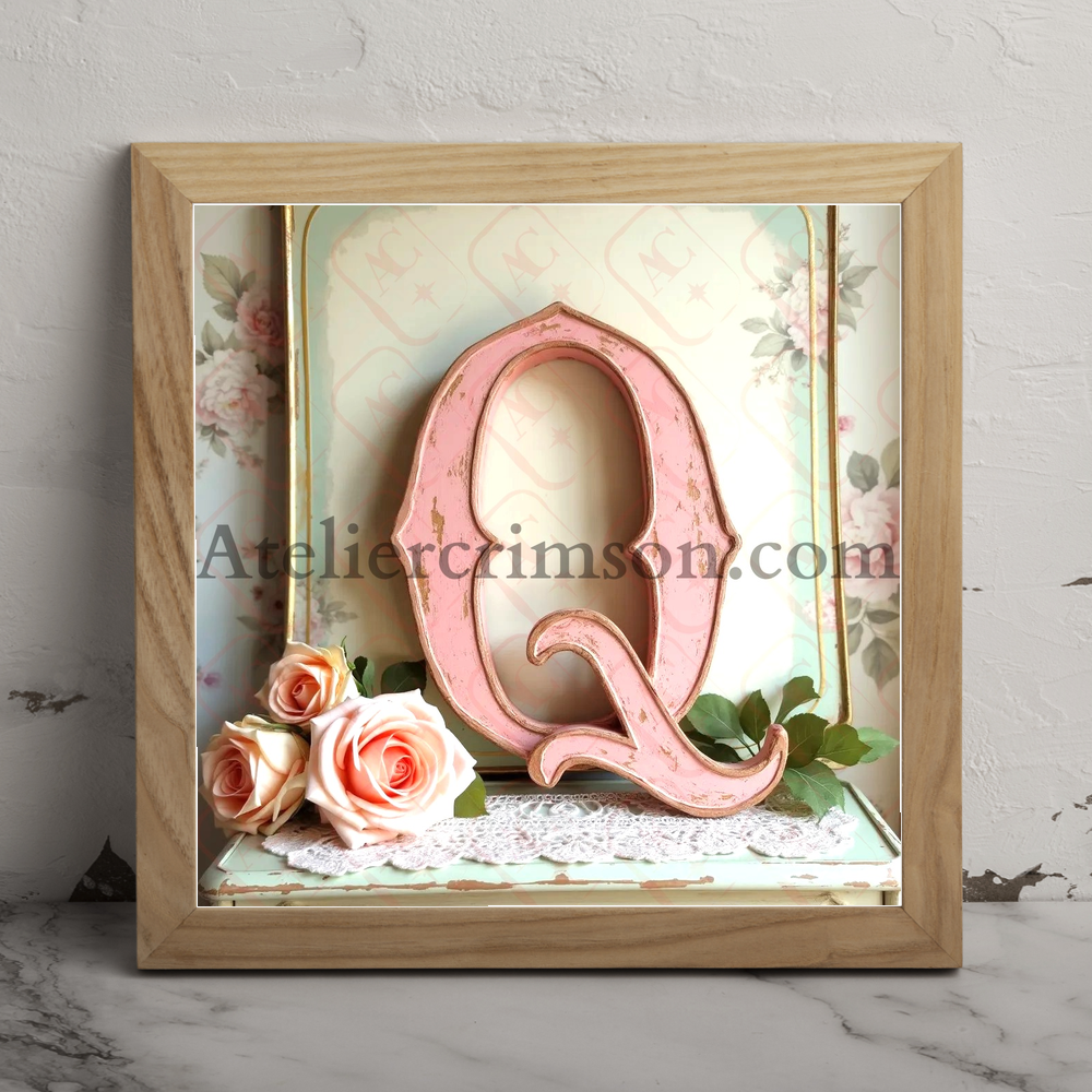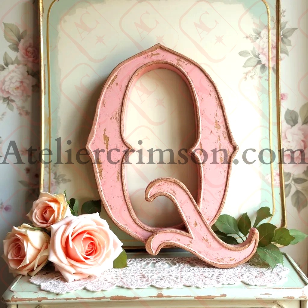 The letter Q pink and shabby chic This charming series presents the alphabet reimagined in a delightful shabby chic style. Each letter is crafted from weathered pink wood, standing proudly against a soft cream background. The collection exudes a romantic, vintage atmosphere with its elegant typography and subtle decorative elements.