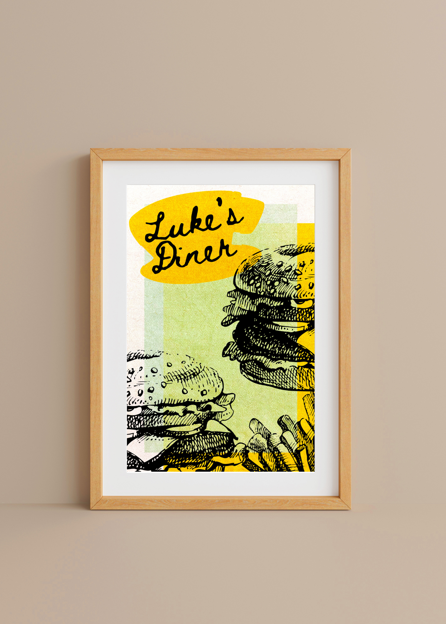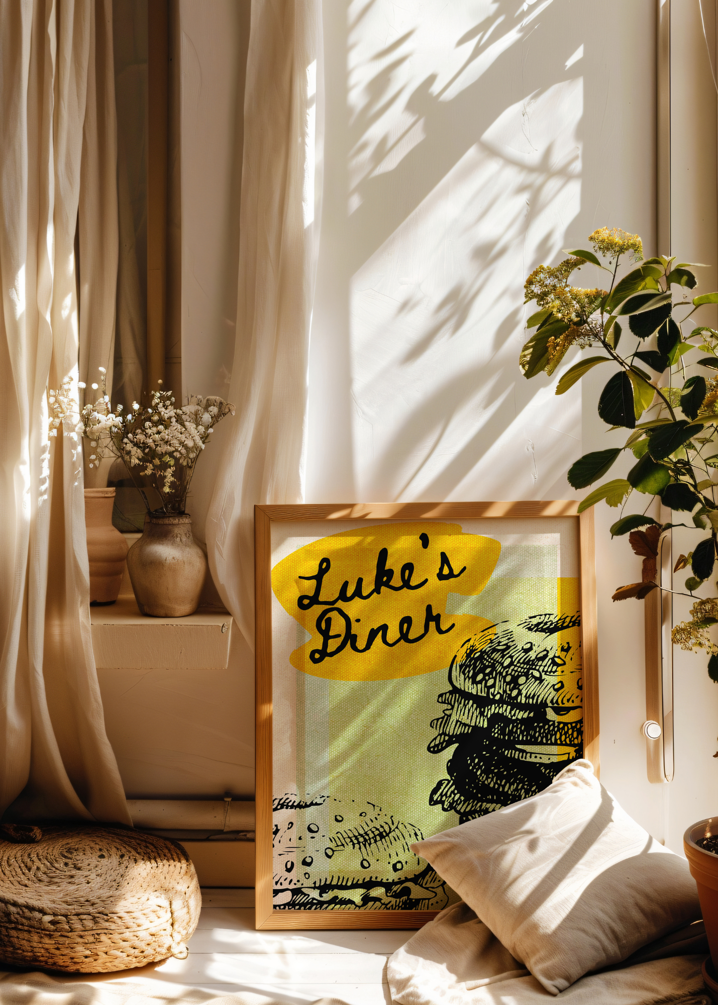 Luke's Diner— A playful tribute to the heart of Stars Hollow, this original artwork captures the charm and whimsy of the beloved diner from Gilmore Girls, Bright, inviting, and full of character— it's a piece made for fans who find comfort in coffee, conversation, and a little small-town magic.