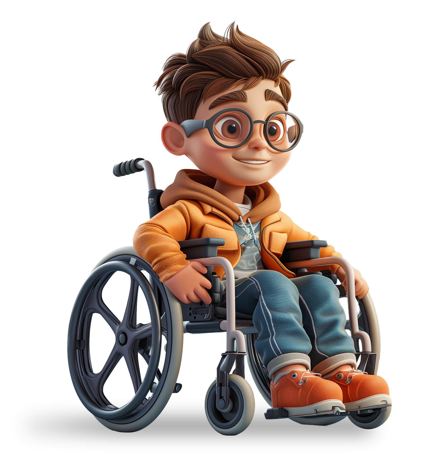 This image depicts a boy with stylish hair, wearing a hoodie and jeans, seated in a modern wheelchair. The boy had a cheerful smile while exuding confidence and positivity.