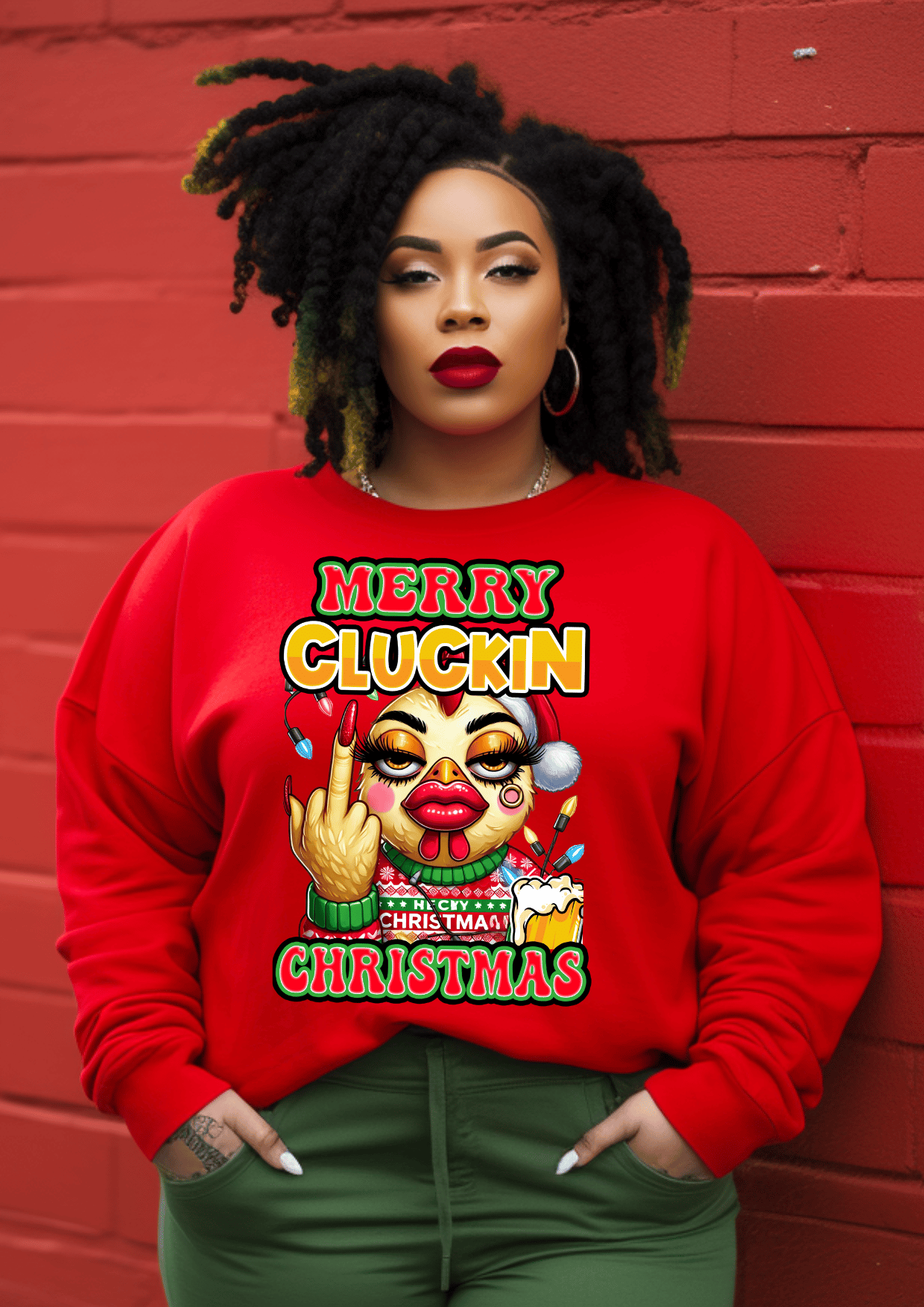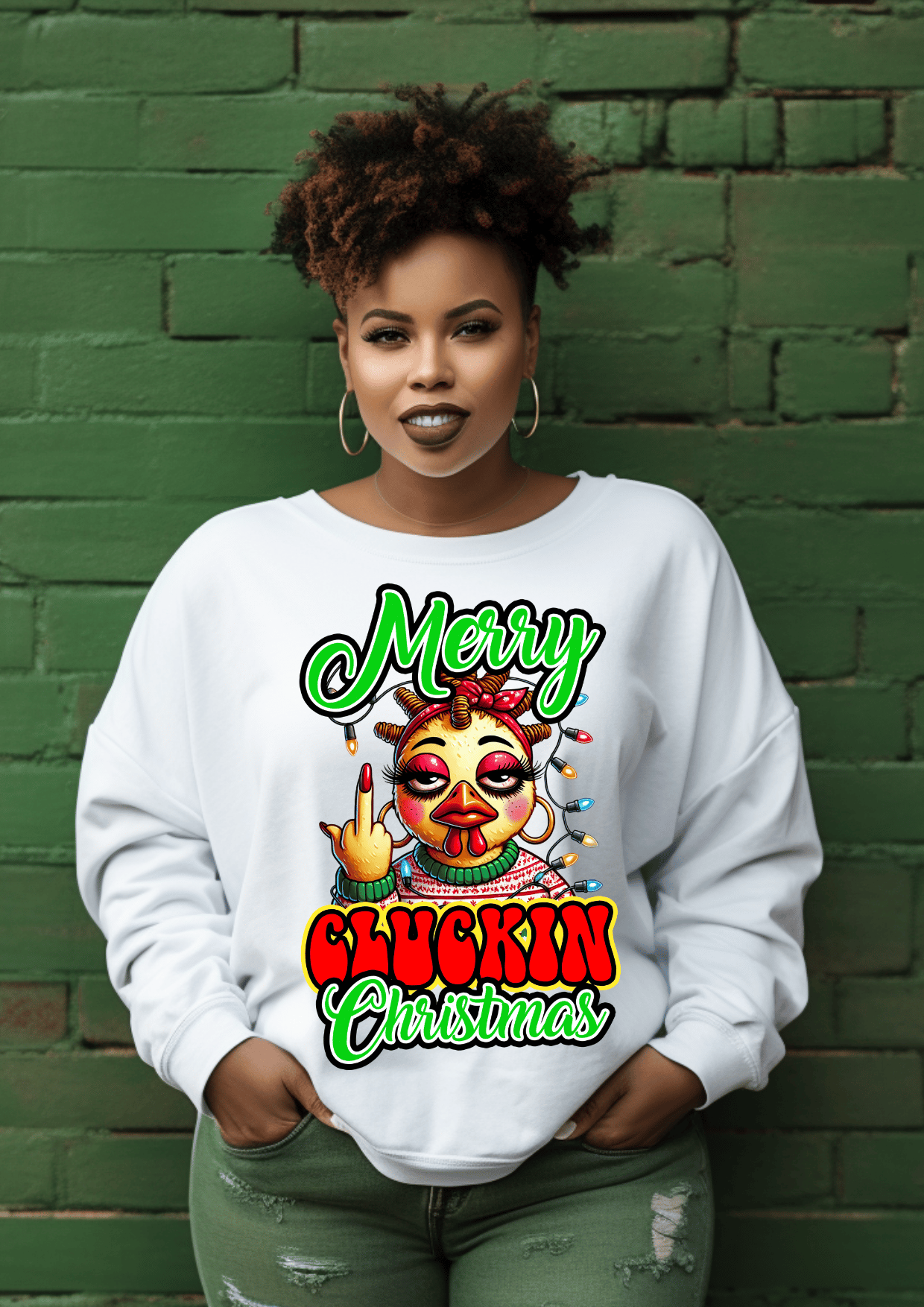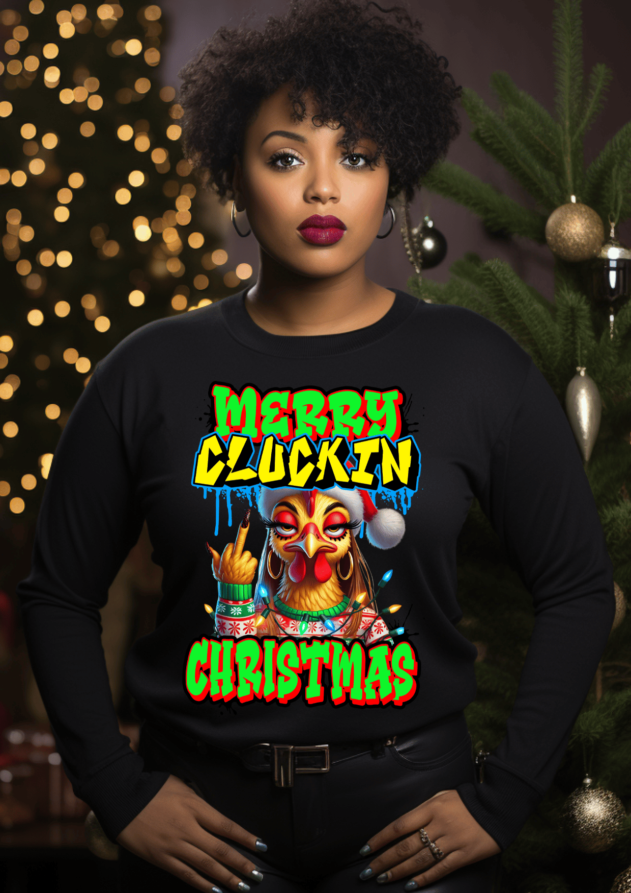 You’ll get five unique, high-resolution chicken designs — each one with bold colors, holiday lights, and festive sass.