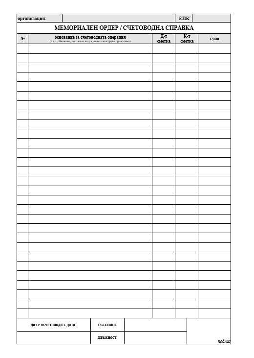 Мемориален ордер / счетоводна справка с включени 29 реда за описание.