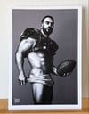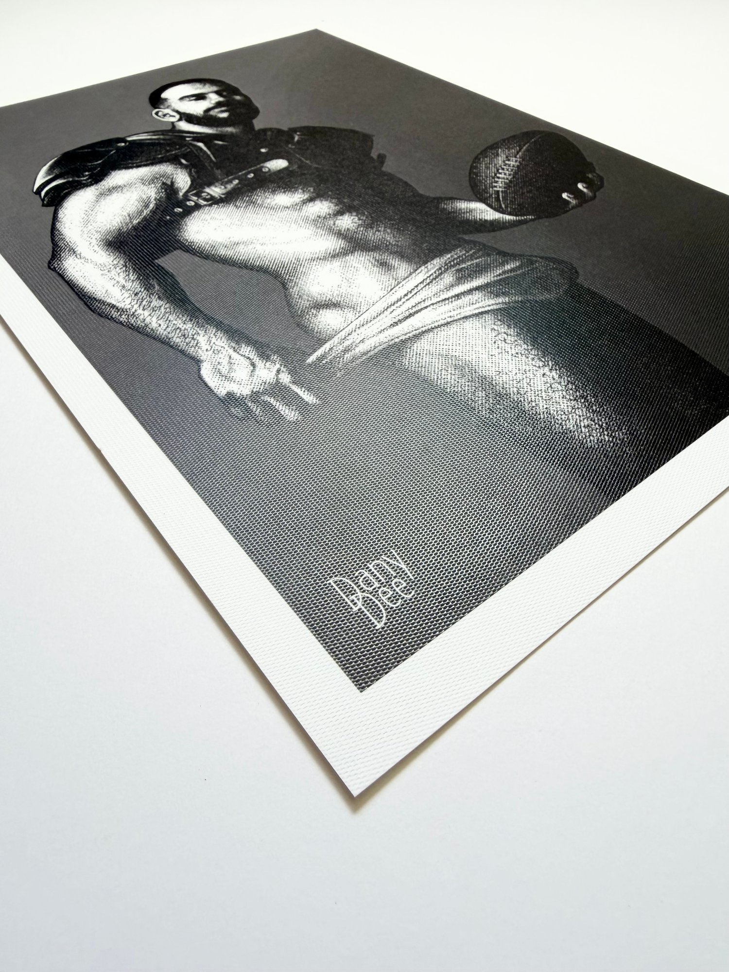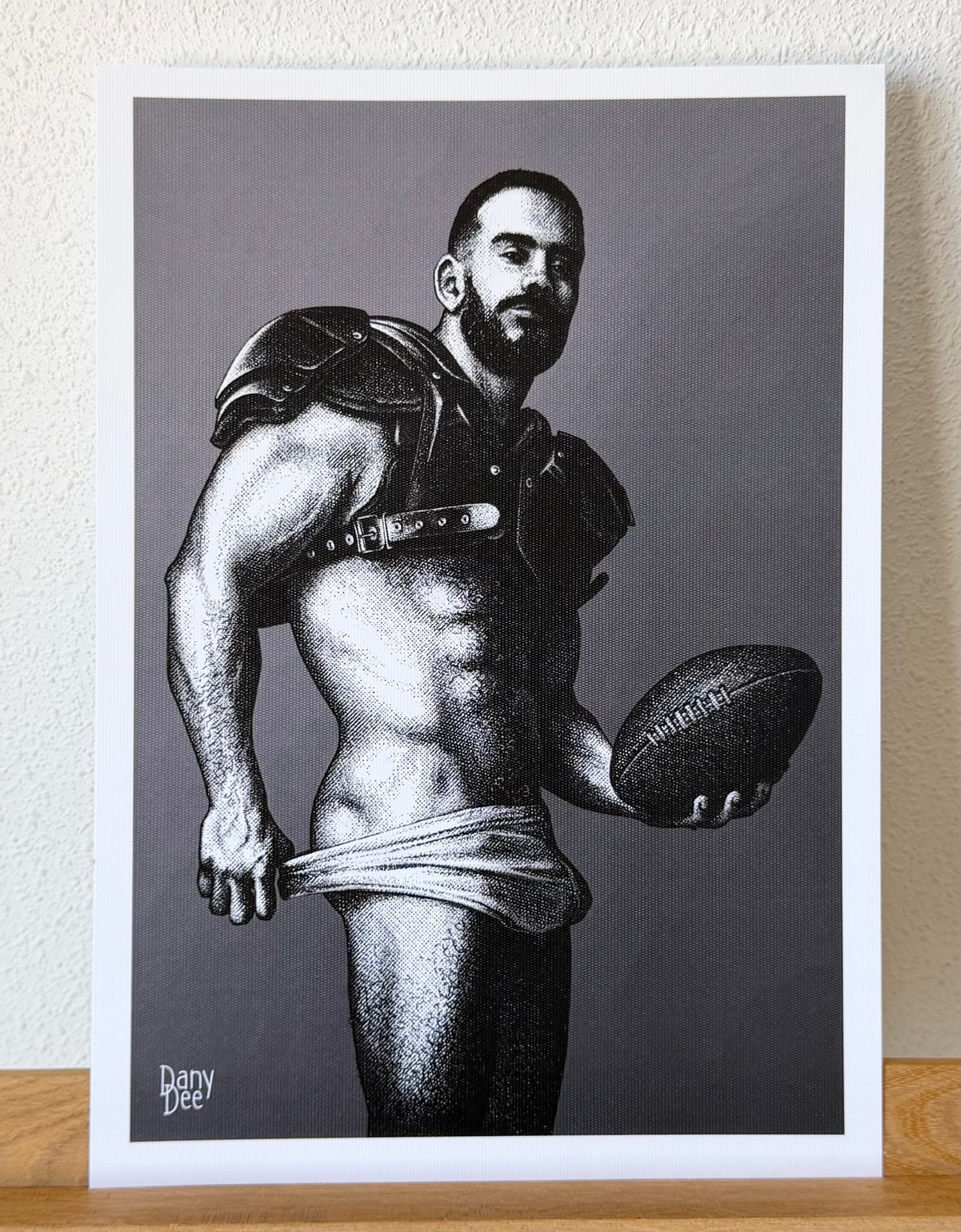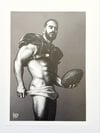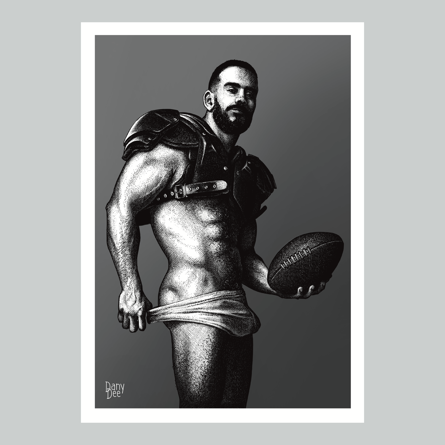 “The Winner” is a hand-drawn, monochromatic A4 art print celebrating gay sports fetish culture — a bold homoerotic illustration of a powerfully built hairy man in a full American football armor, bare-chested beneath it, holding a ball with the ease of someone who has already won.