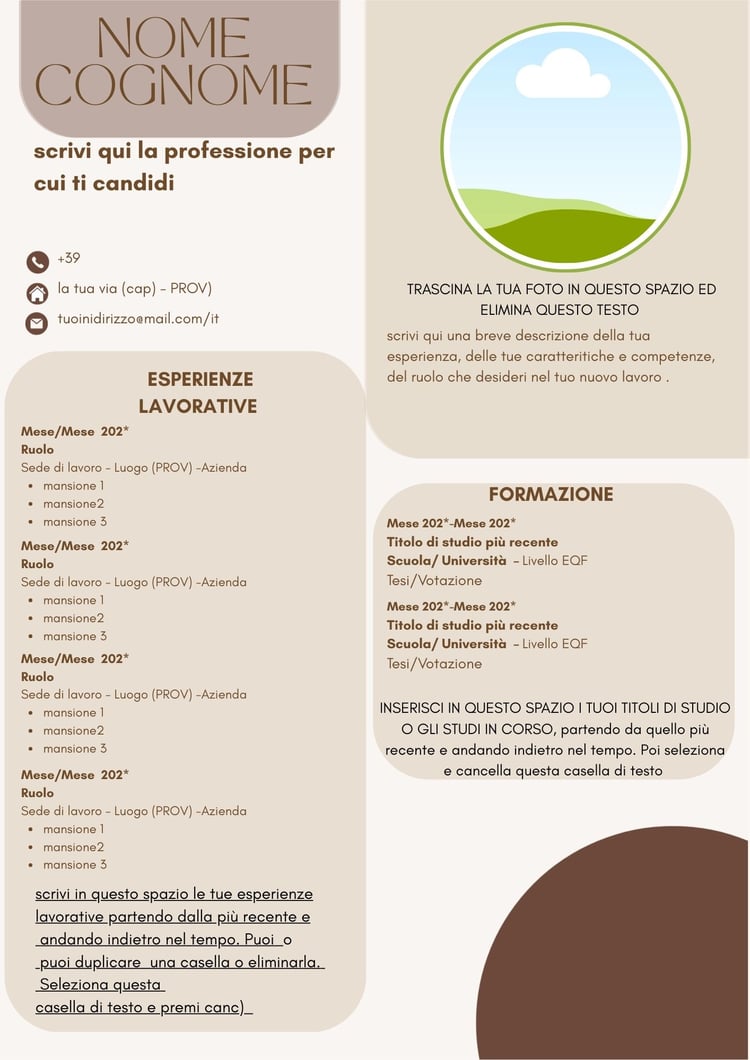 Questo modello di Cv è pensato per le persone con poche esperienze di lavoro, studio e formazione, che hanno quindi bisogno di una pagina unica in metterle in ordine. Aprendo il file trovi il link al modello che puoi aprire su Canva (non servono app) e modificare con i tuoi dati e le tue esperienze.