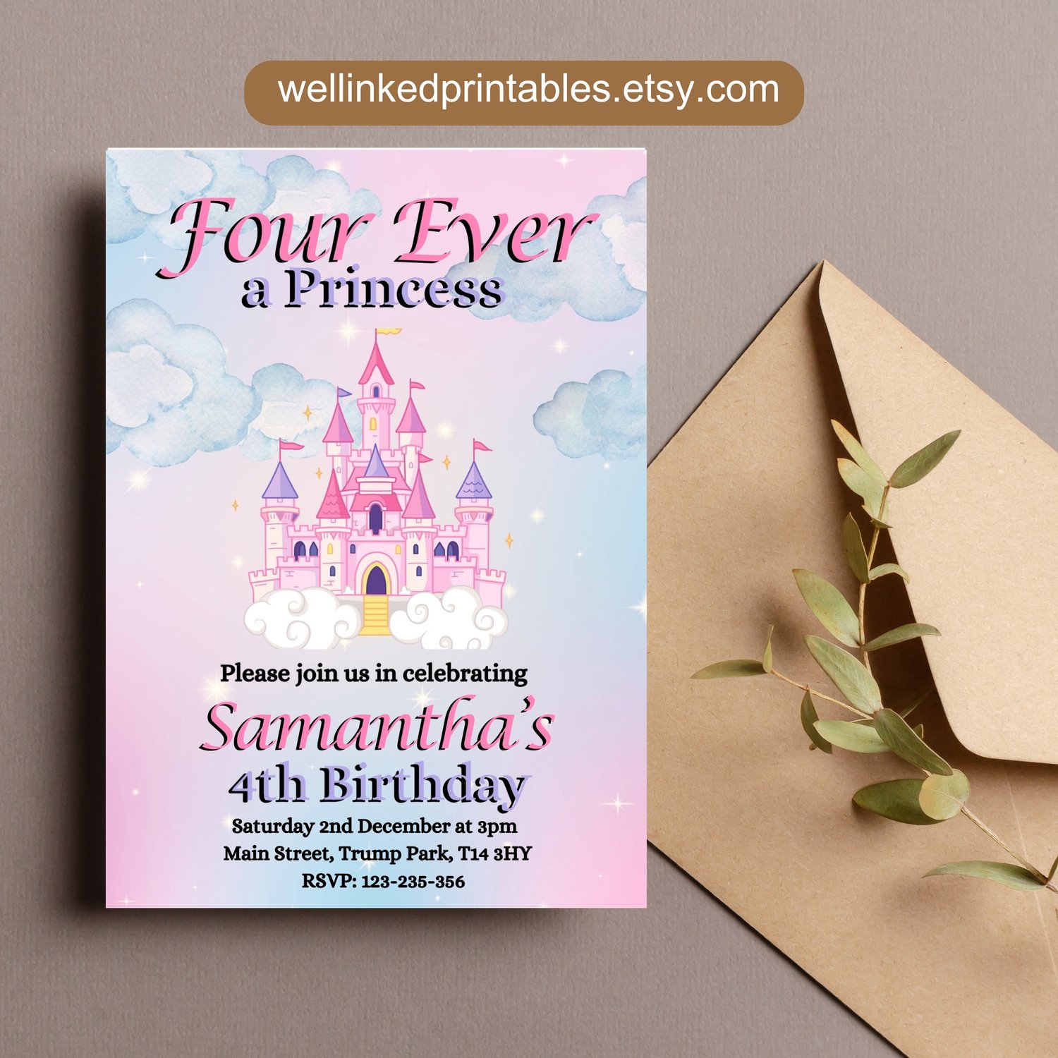 Four Ever a Princess Birthday Invitation | Editable Pink Princess 4th Birthday Invite | Printable 5" x 7" Canva Template | Girls Birthday
