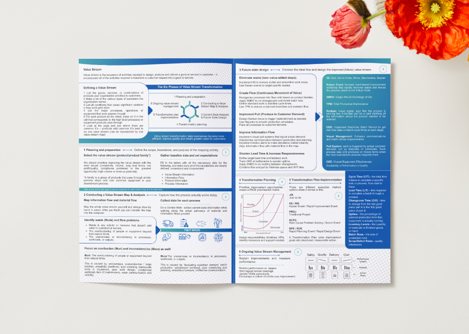 A concise, structured overview of the Value Stream Mapping methodology, outlining current-state analysis, future-state design, and improvement prioritisation. This at a glance guide gives you a condensed summary of all you need to do about current and future state value stream mapping.