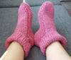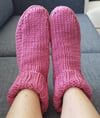 These chunky slipper-socks have a rib cuff then the foot is worked in stocking stitch, with a garter stitch sole. Warm, soft and so comfy to wear, you’ll never want to take them off!