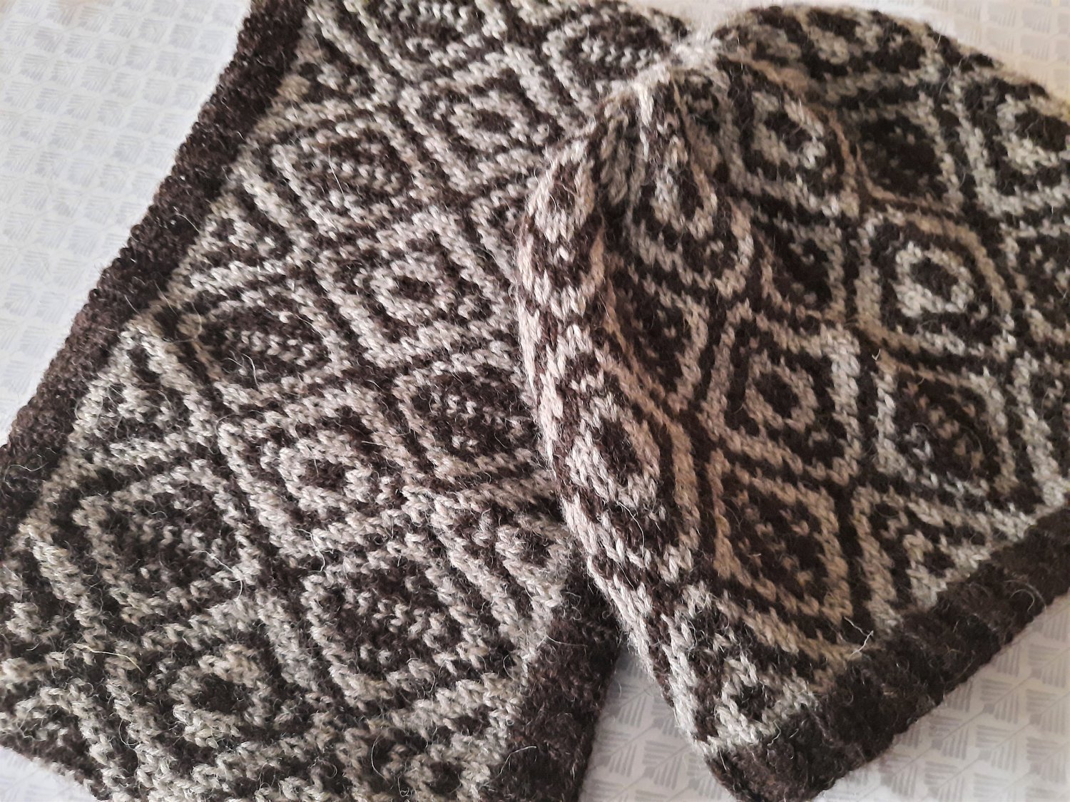 The pattern stitch is 16 stitches over 30 rounds (I would suggest casting on at least 32 stitches - 2 repeats therefore, divided by a marker, to have