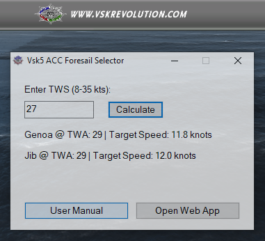The Vsk5 ACC Foresail Selector is a lightweight application designed to help sailors quickly choose the optimal foresail for the ACC class yacht in Virtual Skipper 5 (Vsk5).