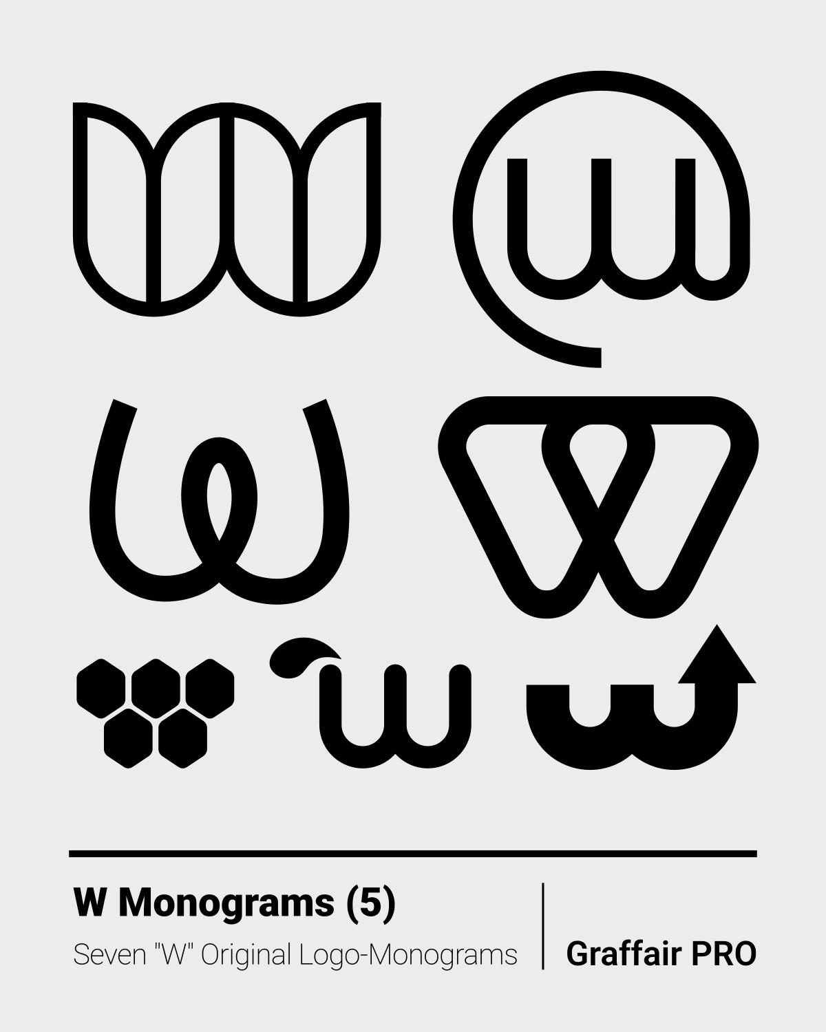 W Monograms (5): The 5th set of seven original "W" logo-monograms, included in the "1050 SVG Monograms" super bundle, amongst others, which also features an Index catalog.