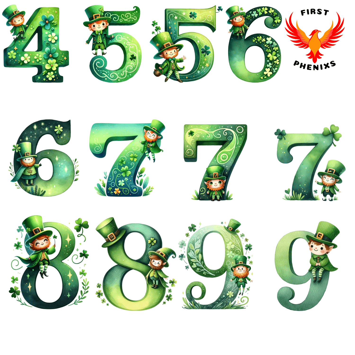 Discover the charm of St. Patrick's Day with our set of 47 cute green PNG watercolor cliparts, featuring a delightful Leprechaun-themed alphabet and numbers collection. Each clipart is a masterpiece, meticulously designed to add a touch of Irish luck and festivity to your creative endeavors.