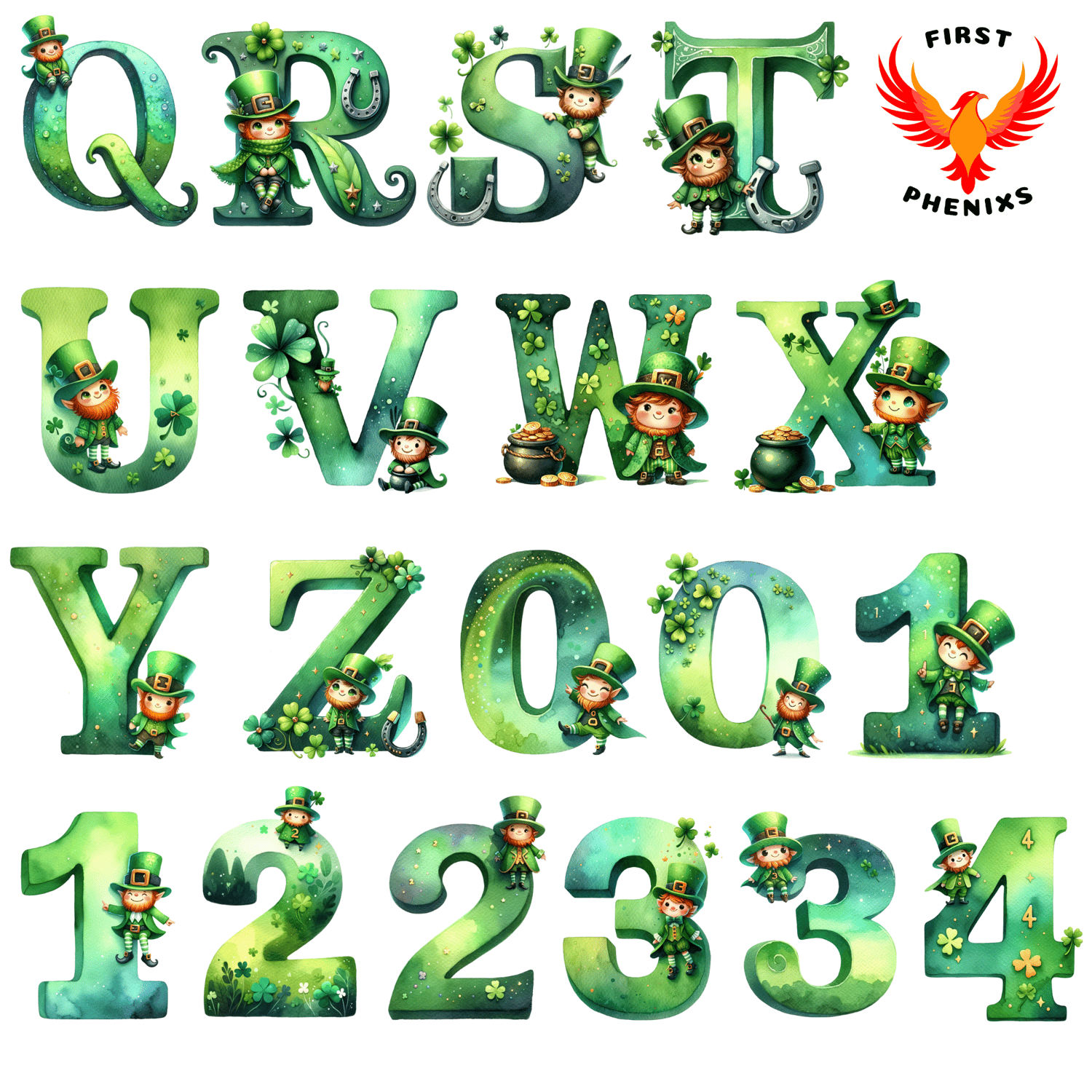 47 Green Watercolor Clipart: Leprechaun Alphabet & Numbers - St. Patrick's Day Kids' Set with Pot of Gold Coins, Irish-Themed PNG