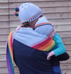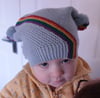 Stua (Irish for Arc) is a biased garter stitch hat with a square top. The hat features diagonal rainbow stripes, and is completed with rainbow pom poms. Stua is knitted flat, grafted into a tube and closed with a seam along the top.