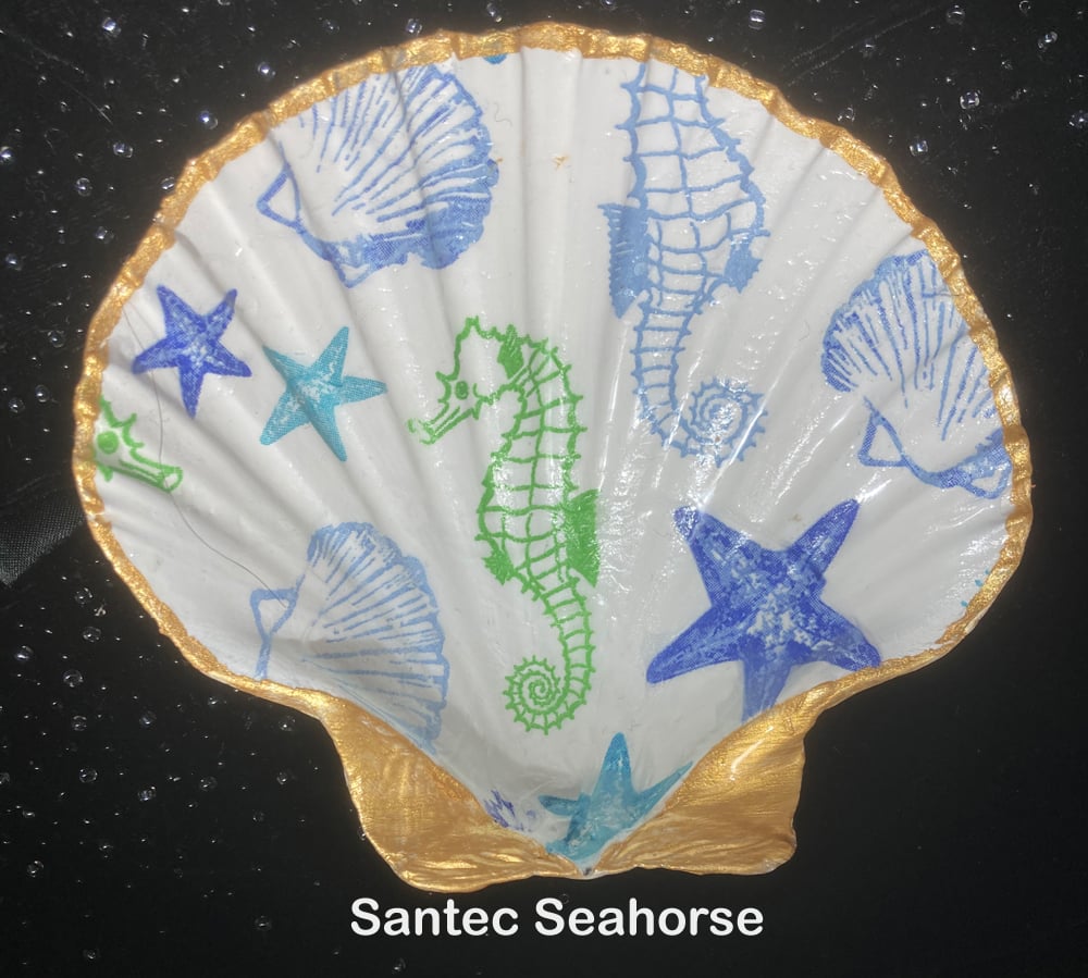 Hippocampe, étoile de mer et coquillages dans les tons bleu et vert sur fond blanc.