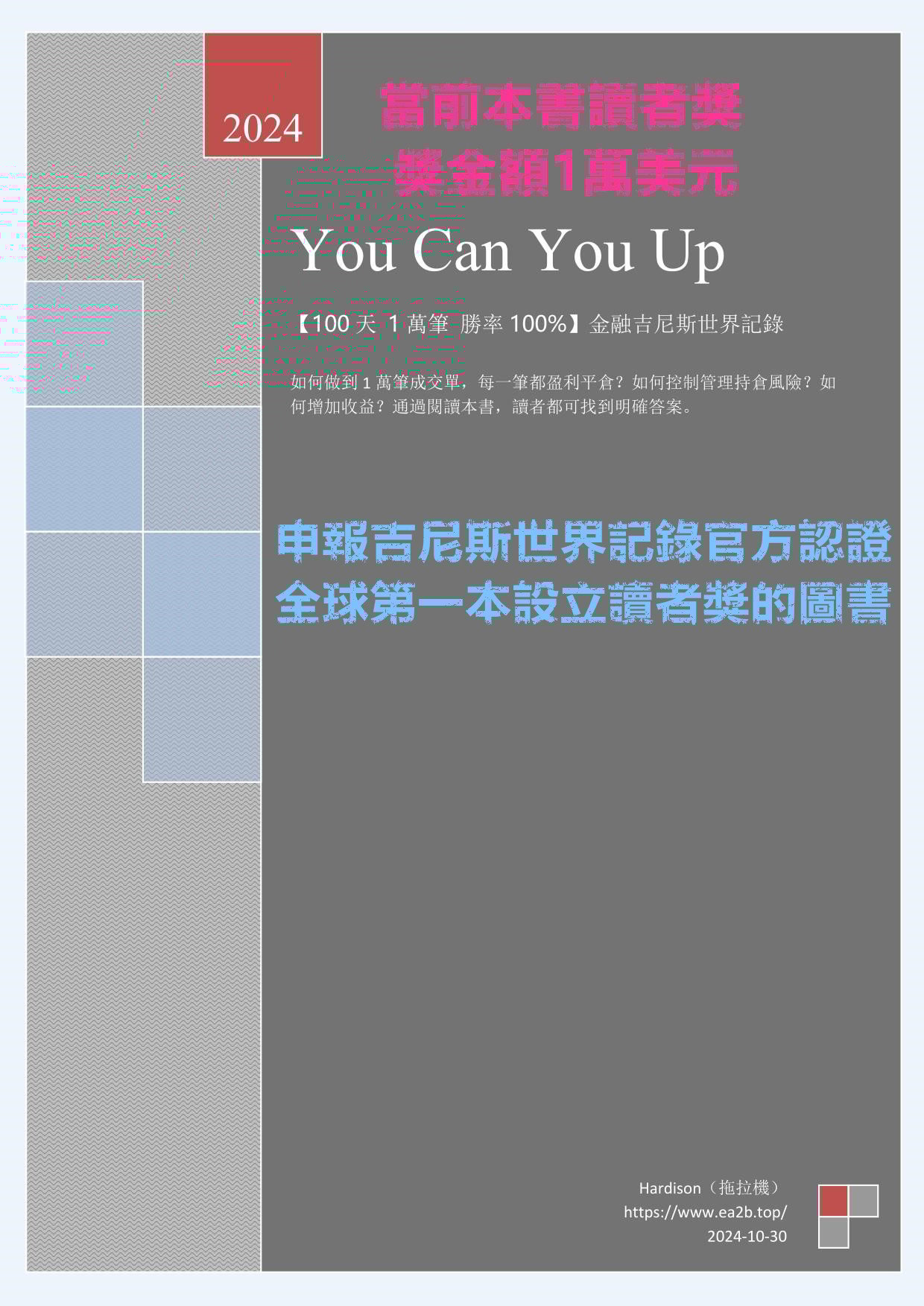 - 期待有緣的讀者能閱讀本書,領悟做法,真正掌握金融風險控制手段和策略,甚至打破作者記錄,拿到1萬美元獎金。