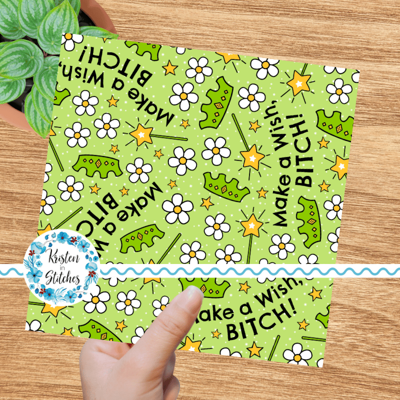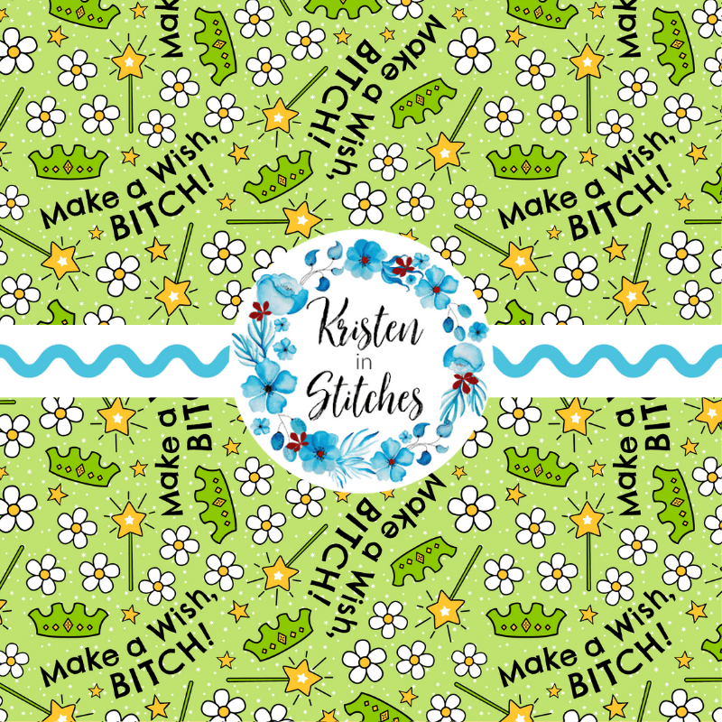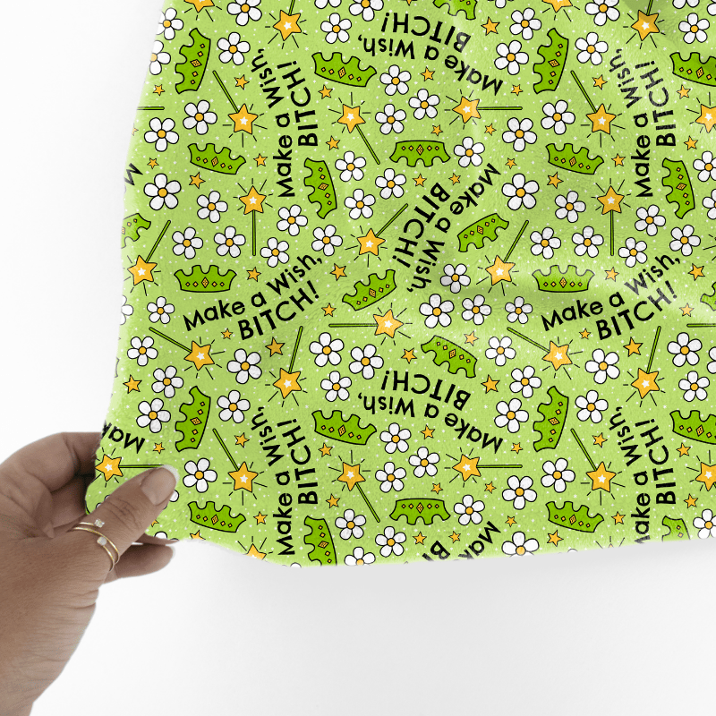 Make a Wish, Bitch! Sweary pattern with princess crowns, fairy wands and daisy flowers.