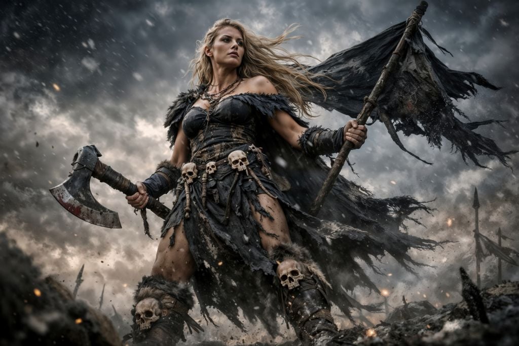 She stands where thunder breaks and oaths are carved into stone. Stormbanner of the Blood-Bound captures a Viking war-queen at the height of her fury—axe heavy with history, banner torn by wind, and the spoils of battle worn as grim heraldry.