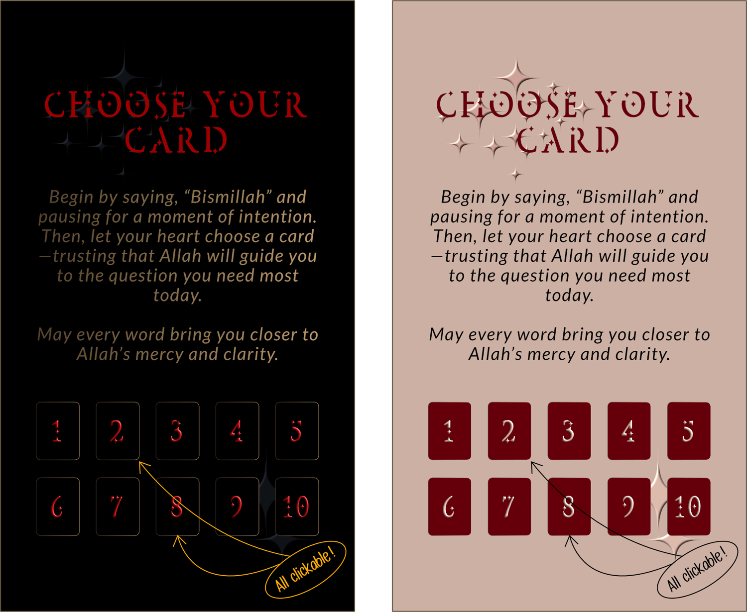 A deck of 10 reflective prompts designed to deepen your du'a and steady your heart. Each card carries one question and gentle guidance—so your next conversation with Allah feels clear, safe, and sincere.