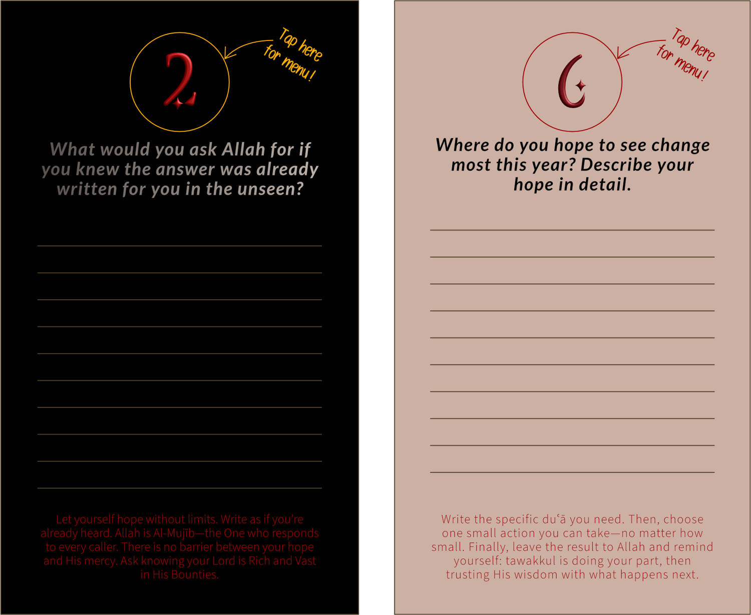 Choose your mood: Dark Mode for night journaling and quiet intensity, Light Mode for daytime clarity and softness. Your journal becomes the witness, and your words the offering.