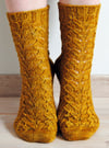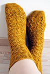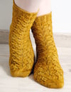 Emmer Wheat Socks are worked from the toe-up in a softly undulating stitch pattern that brings to mind sheaves of wheat at harvest time. The lace and cables pattern is foot hugging, giving a snug fit. Knit the socks in a solid or semi-solid color and let the lace pattern shine!The pattern features a gusset-and-flap heel construction that doesn’t require picking up stitches. Right and left socks are identical, perfect for working socks two at a time.