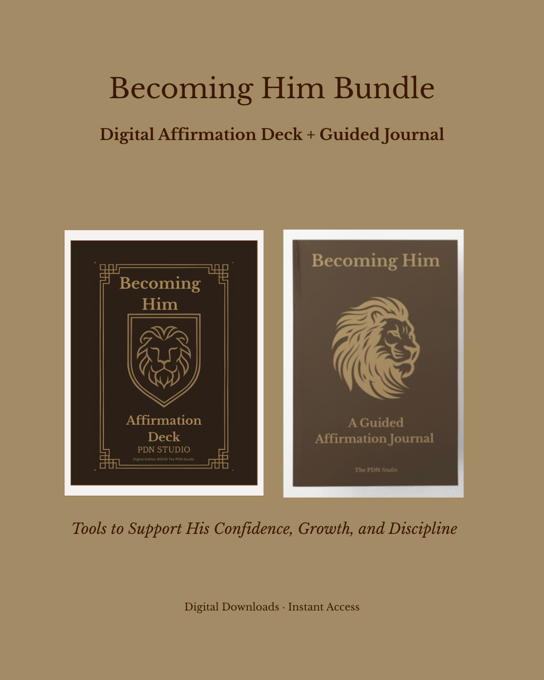 The Becoming Him Bundle brings together two powerful tools designed to support a man’s growth from the inside out. This set includes the Becoming Him Journal and the Becoming Him Digital Affirmation Cards, a guided combination built to strengthen confidence, discipline, emotional resilience, and self-worth.