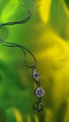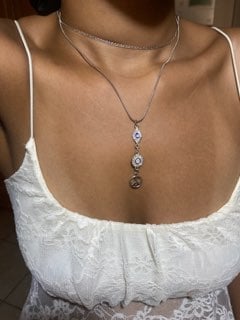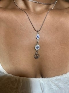 This handmade silver necklace features two diamond-shaped evil eye charms and a sleek silver peace sign, creating the perfect balance of protection, power, and peace.
