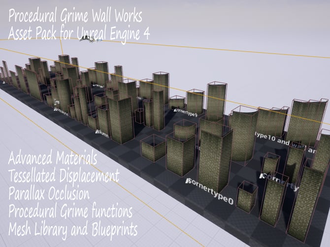 Procedural Grime WallWorks Asset Pack for Unreal Engine 4. Package contains, Advanced Materials (Tessellated Displacement Mapping, Parallax Occlusion PDO Mapping). Custom Material Functions (Procedural Grime, Displacement and Blend Material functions). Custom Blueprints (Mesh setter helper bps). Mesh Library (PreTessellated). Example Textures (4096x4096). Full Documentation. Unreal Engine 4 (version 4.18 and above) will need be to installed to use this package.