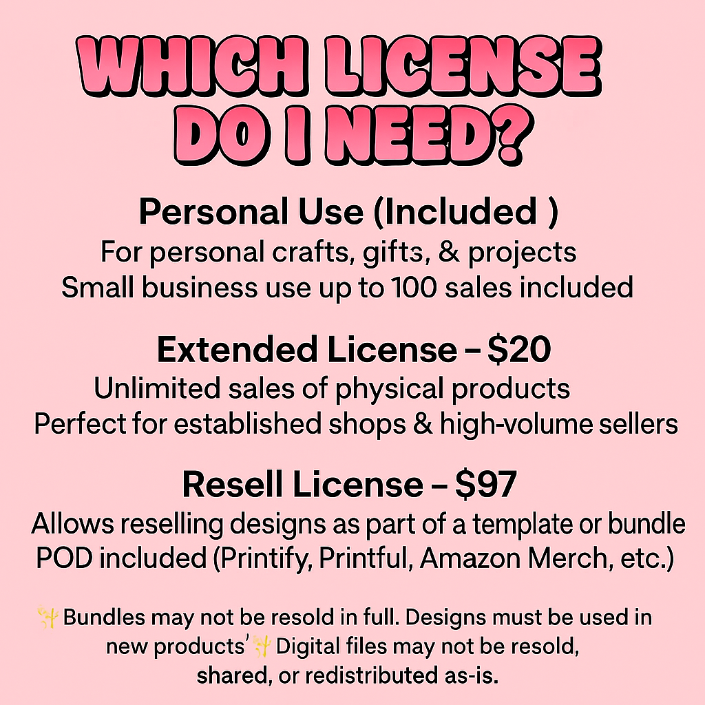 Personal/Commercial use (up to 100 sales) is included with every purchase. For sellers, Extended License ($20) covers unlimited physical product sales. Resell License  ($97) everything in Extended PLUS use inside your own templates/bundles + POD. Licenses apply per product or bundle. 🚫 Original files cannot be resold or shared as-is.