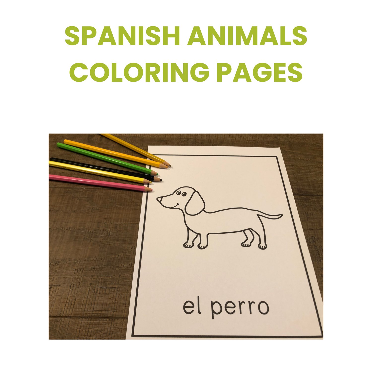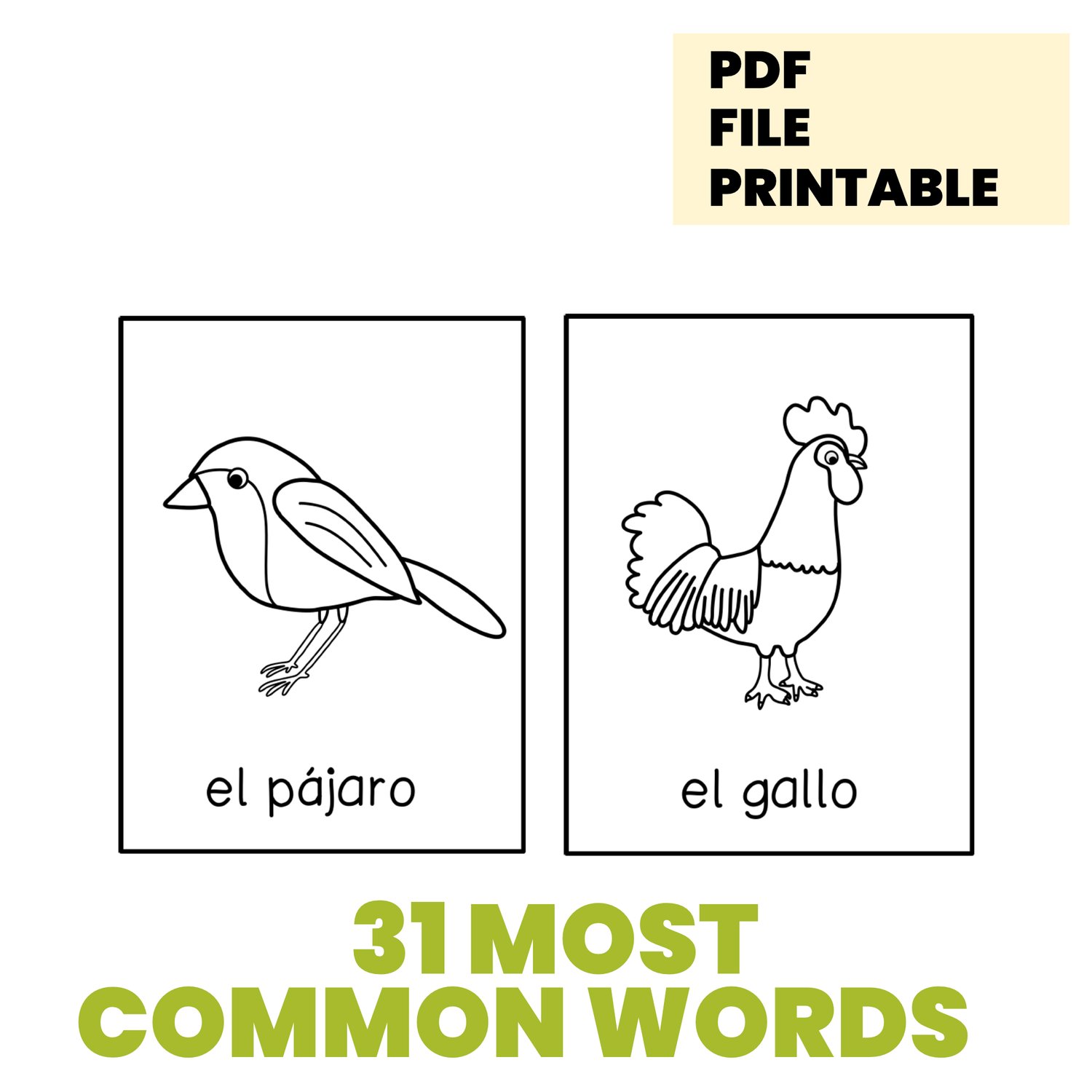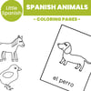 - 31 pages in BW with most common animals in spanish : perro,caballo, pájaro, gato, león, toro, vaca, gallo, gallina, paloma, mariposa, ratón, mosca, pollo, rata, pez, serpiente, cerdo, tigre, lobo, mono, oveja, gusano, araña, oso, hormiga, conejo, pato, elefante, tortuga, abeja