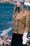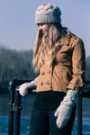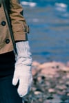 For the mittens, the long garter and cable cuff is knit sideways and grafted, then stitches are picked up for the hand and worked in the round with a thumb gusset. The extended cuff both hugs the forearm and slouches warmly at the wrist, while the comfy mitten keeps all your fingers warm.
