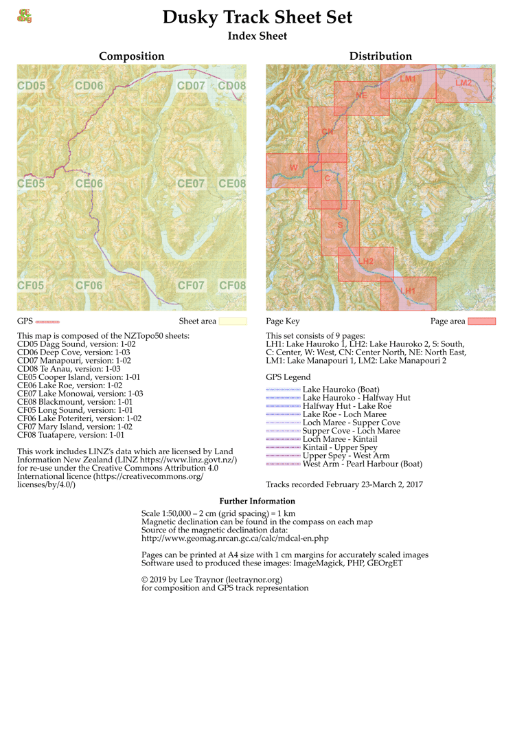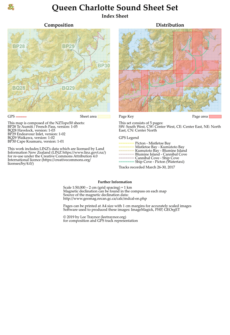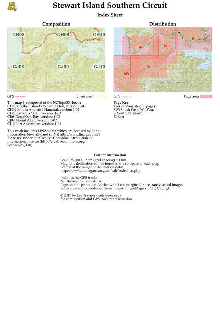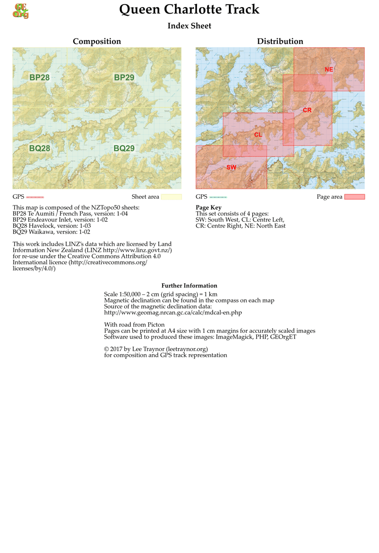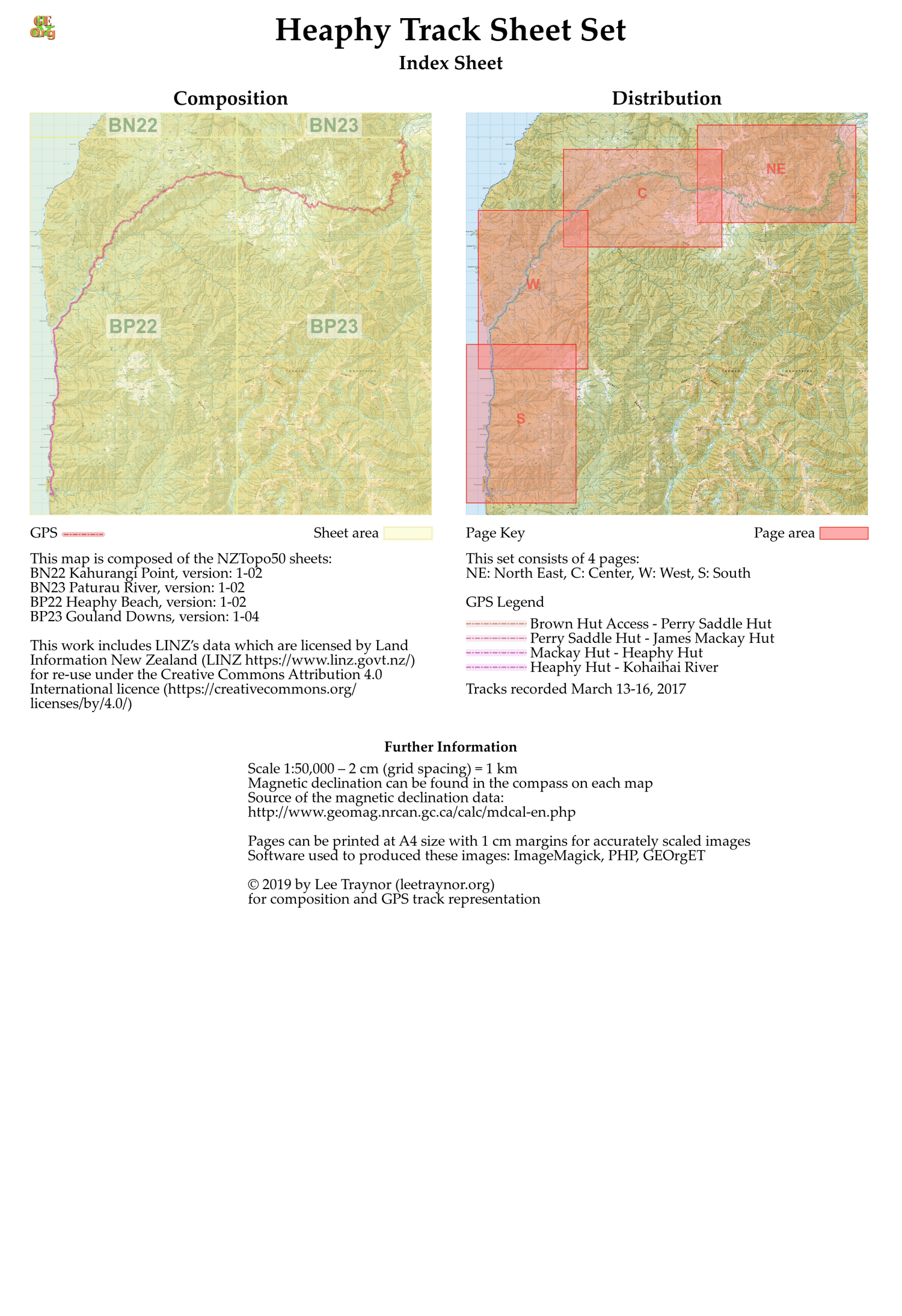 Heaphy Track Topo Set + GPS, index sheet and four individual, overlapping topo maps which can be printed on A4 in true scale.