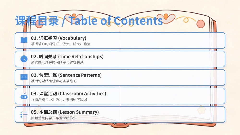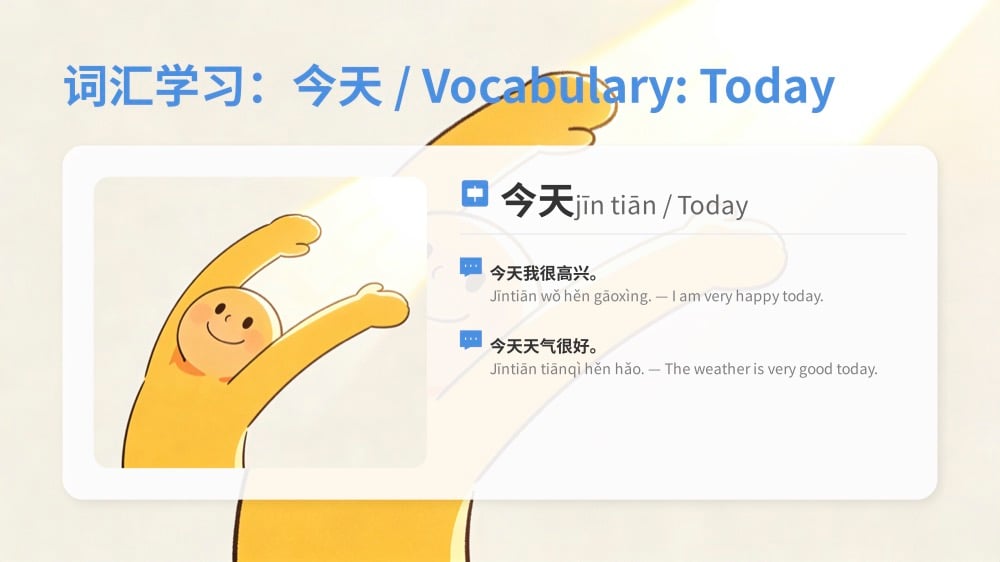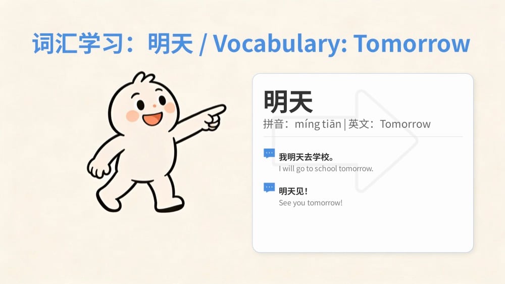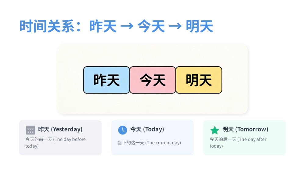 In this engaging lesson, you'll learn how to say "Today", "Tomorrow", and "Yesterday" in Chinese, and how to use them naturally in everyday conversations. Through clear examples, visual aids, and fun interactive practices, you'll quickly understand and remember these key words in a relaxed environment. Whether you're planning for tomorrow or recalling yesterday's fun, you'll be able to express yourself confidently in Chinese.