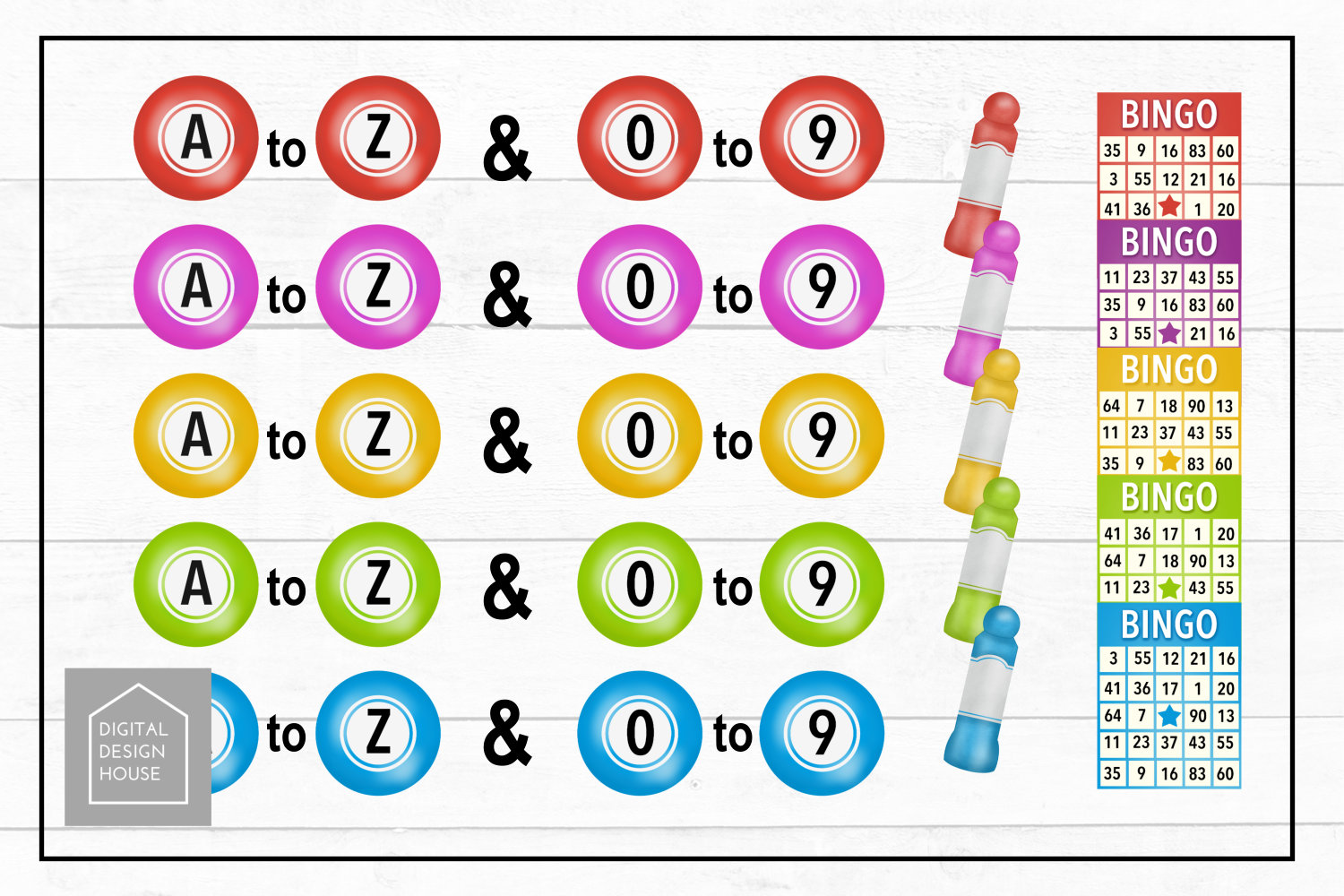This listing is for a BINGO ALPHABET you get 5 Sets of brightly coloured Bingo Balls with letters A to Z and numbers 0 to 9. The balls come in Blue, Green, Red, Orange and Purple. There are also 5 Bingo cards and 5 Dabbers included ready for you to create your own personalised Bingo inspired designs.