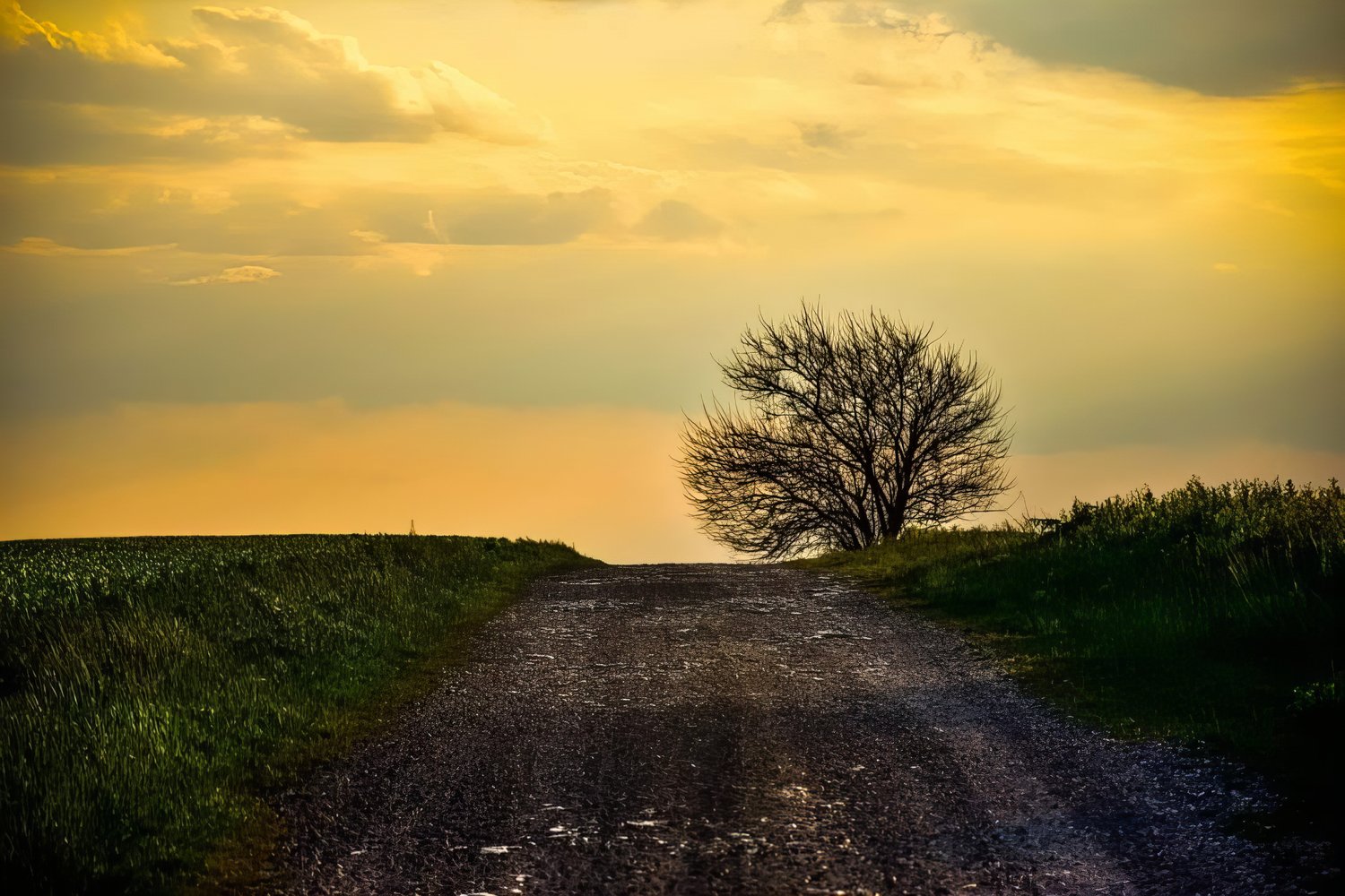 A leafless tree stands beside a gravel road stretching through green fields under a dramatic golden sunset sky. The contrast between the barren branches and the vibrant landscape evokes a sense of solitude and calm reflection. The soft light and warm tones create a peaceful, timeless rural scene.