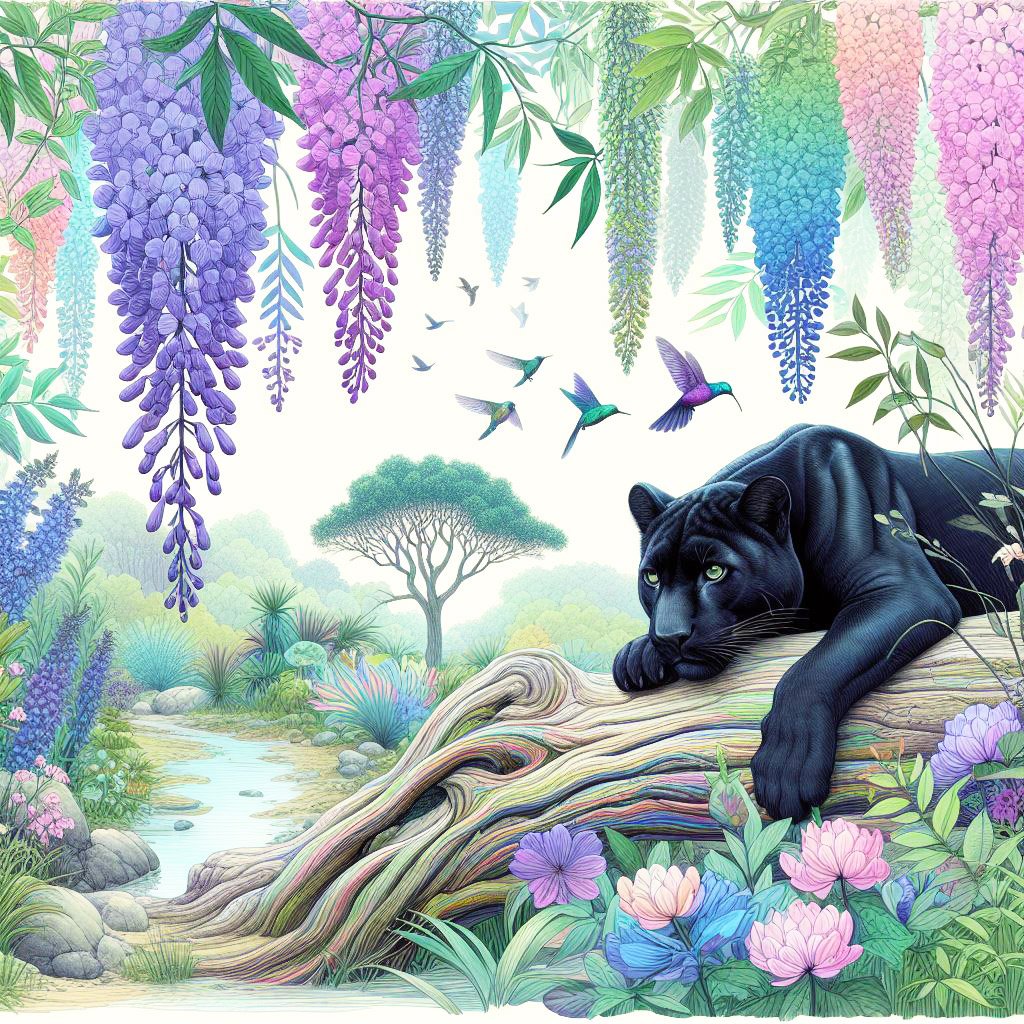 Black panther in a jungle with bamboo which is patterned around him & a tall colourful exotic plants & blue & purple flowers & little river. There are humming birds & a fallen tree.