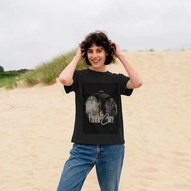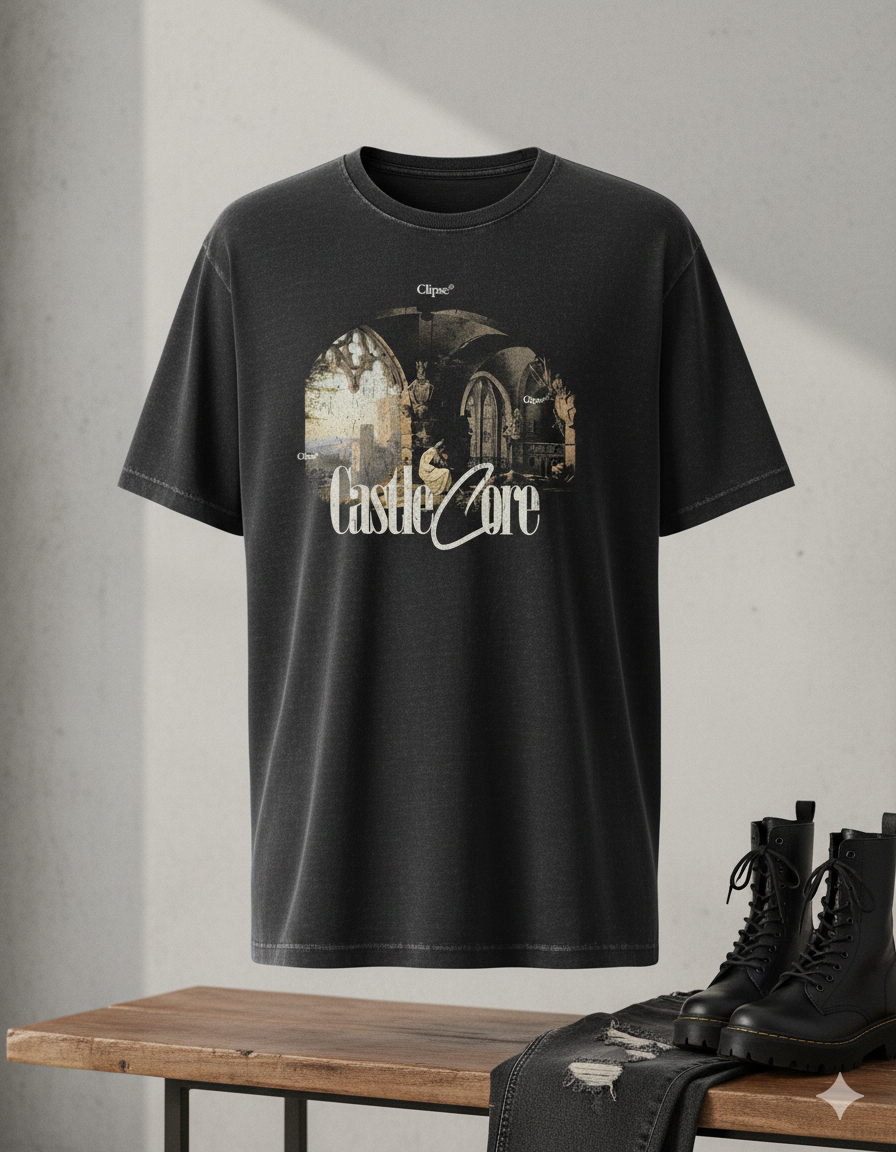 A wearable piece of art. This T-shirt features a digitally-collaged, vintage-style graphic set against a stark black background. It captures a deep, romantic view of a ruined European castle, with an old master's painting feel. The central "Castle Core" text gives it a modern, urban aesthetic, making it an ideal statement piece for lovers of art history and dark, moody fashion.
