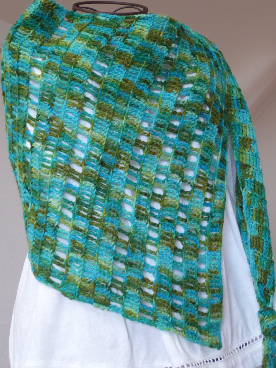 The sample was made with fingering yarn and a 4 mm hook, however, the shawl can be made with any yarn and an appropriately sized hook. It is designed for those one-of-a-kind variegated skeins that fall into your stash but you have no idea what to do with.