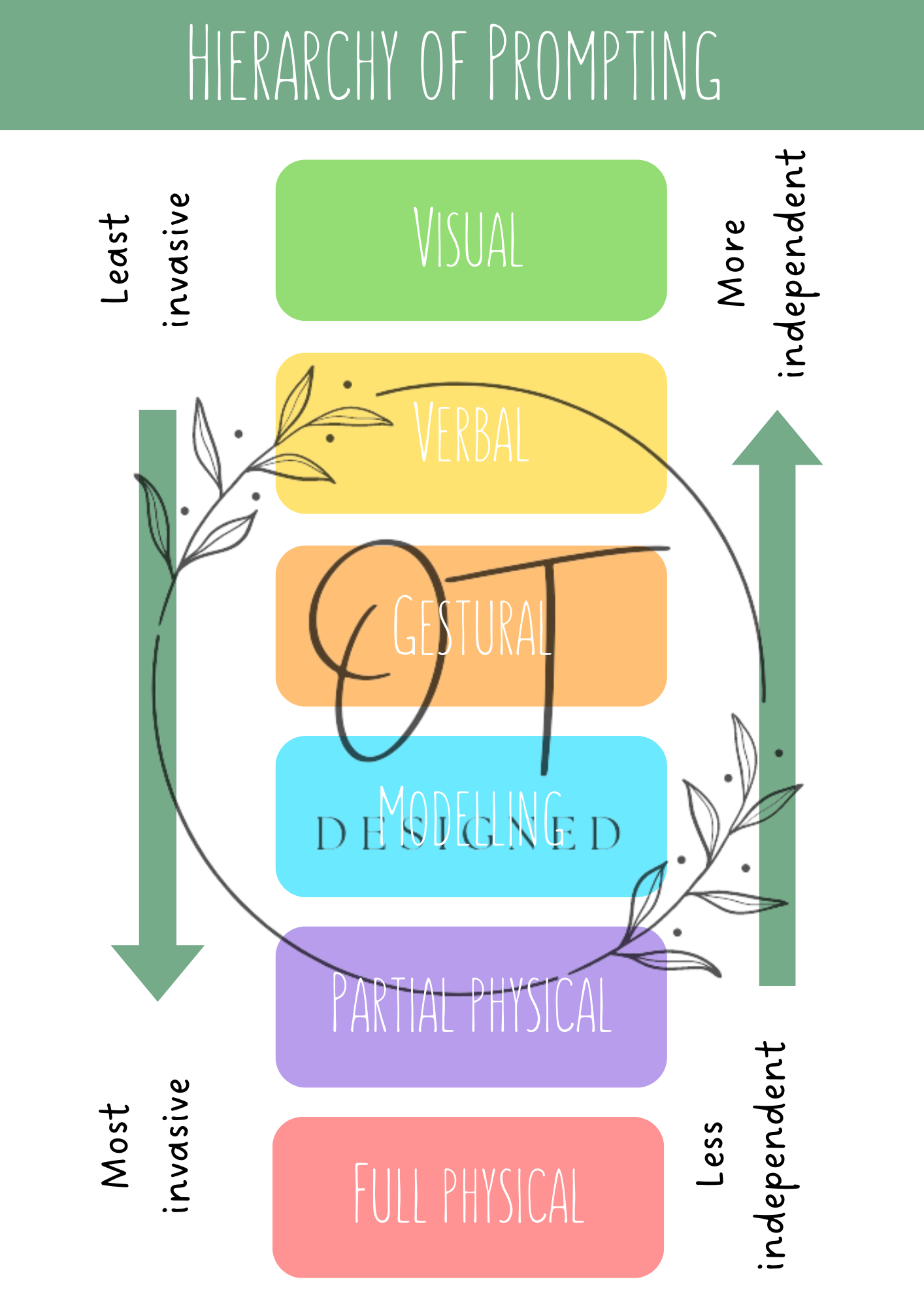 A simple & clear poster of the hierarchy of prompting. I find this resource helpful in explaining how to break down goals by the level of prompting / independence we are aiming to achieve. It is also helpful to include in progress reports as a clear demonstration of the level of prompting the client has required and the level they have progressed to.