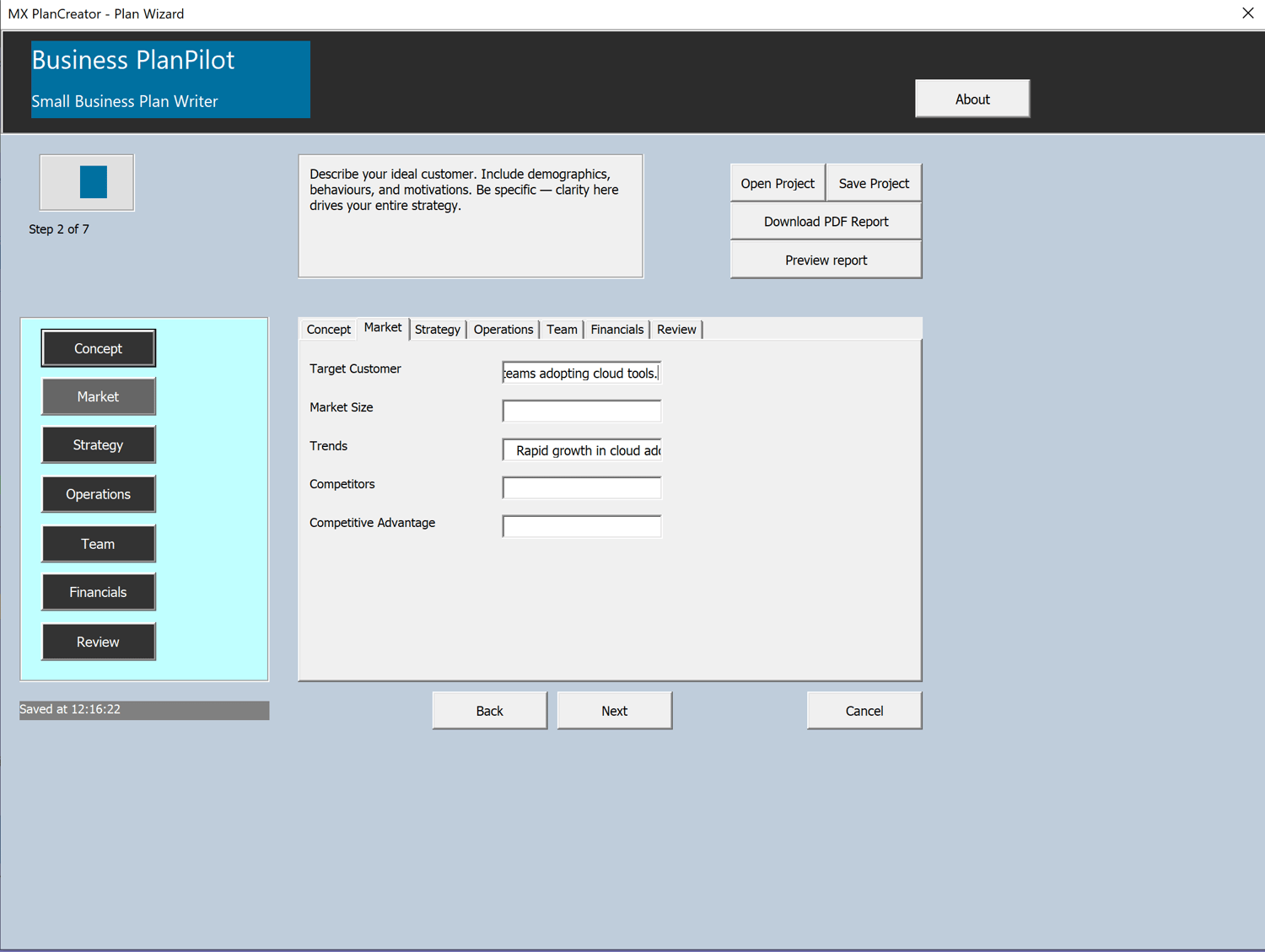Business PlanPilot guides you through every step of building a professional business plan — from concept to financials — with clarity, structure, and confidence