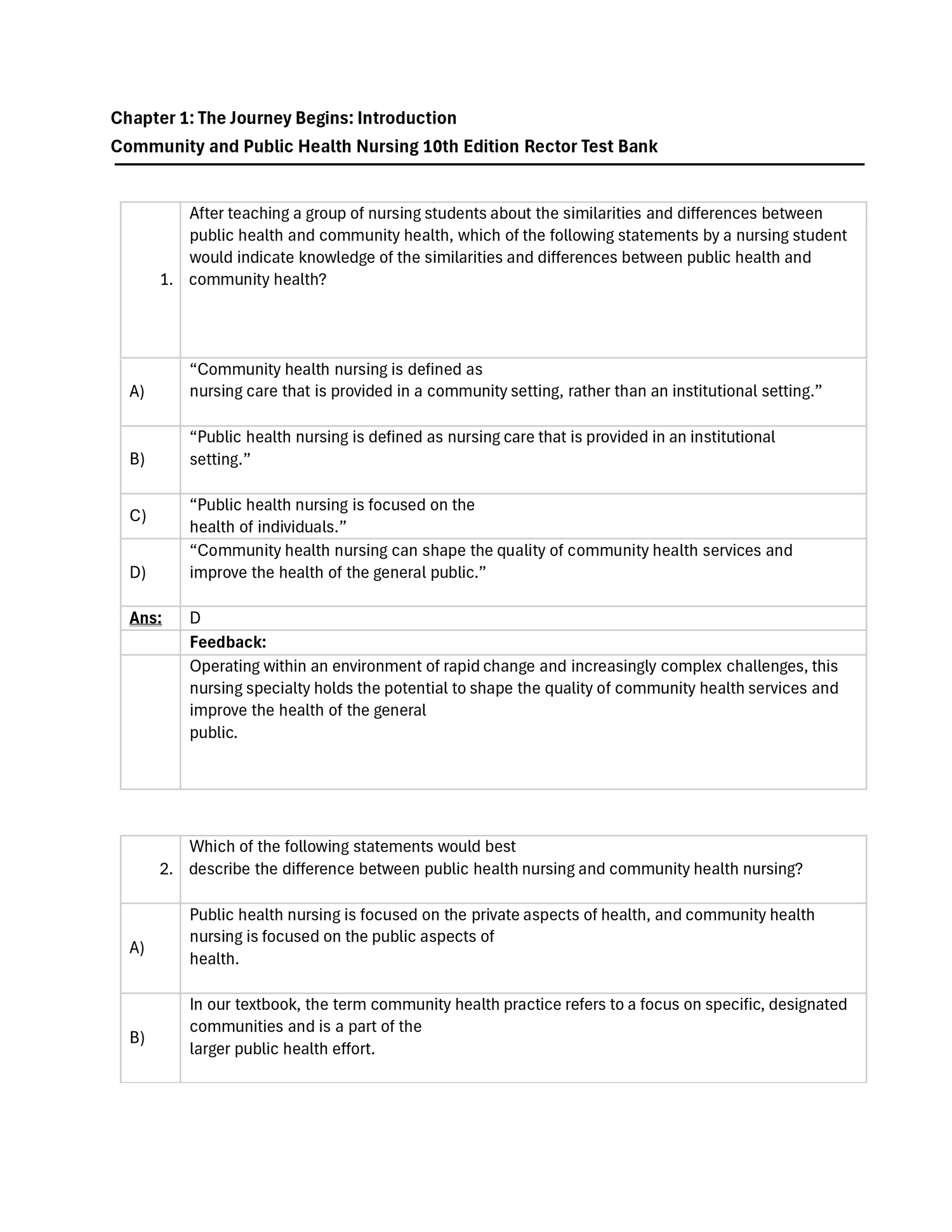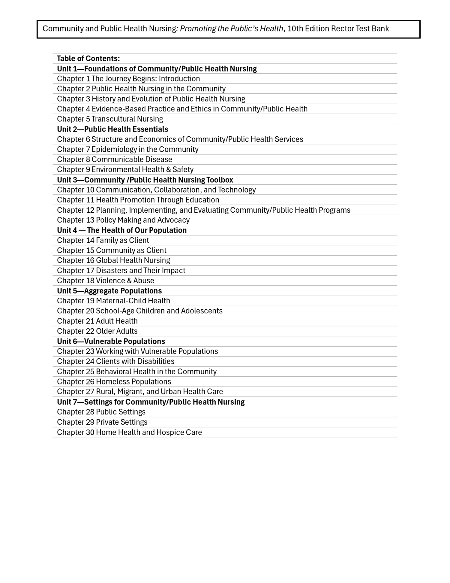 INSTANT PDF DOWNLOAD – Test Bank for Community and Public Health Nursing: Promoting the Public’s Health, 10th Edition by Cherie Rector & Mary Jo Stanley (Chapters 1–30 Complete).